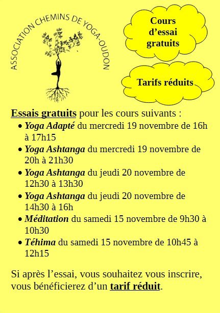L’association « Chemins de Yoga-Oudon » vous propose de participer à un cours d’essai gratuit aux dates indiquées ci-après.