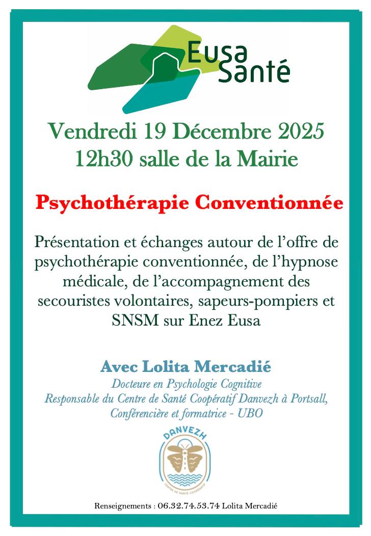 Présentation et échanges autour de l'offre de psychothérapie conventionnée, de l'hypnose médicale, de l'accompagnement des secouristes volontaires, sapeurs-pompiers et SNSM sur Enez Eusa