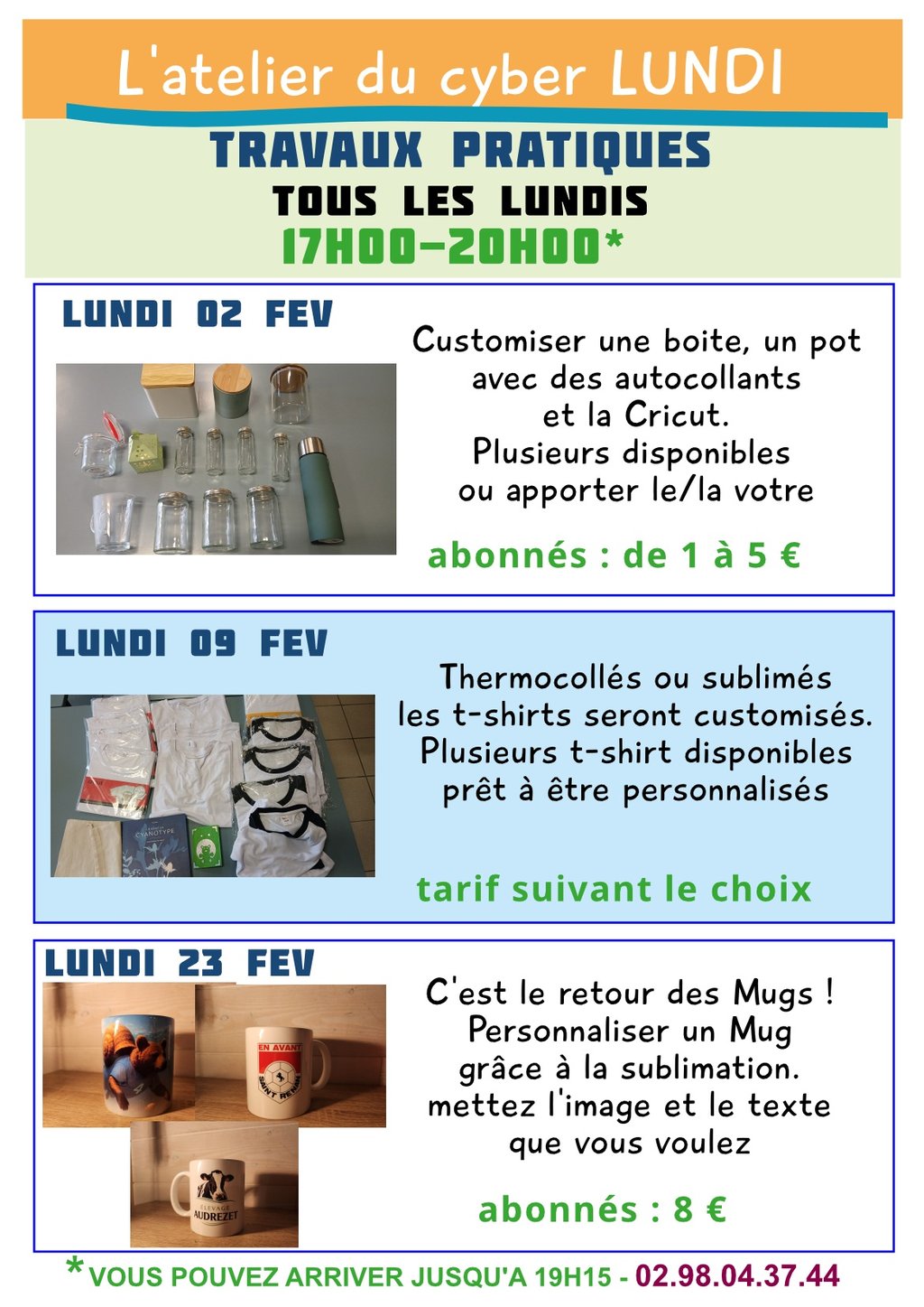 Programme des travaux pratiques à venir à l'atelier du Cyberia. Vous pouvez aussi venir pour un projet personnel.