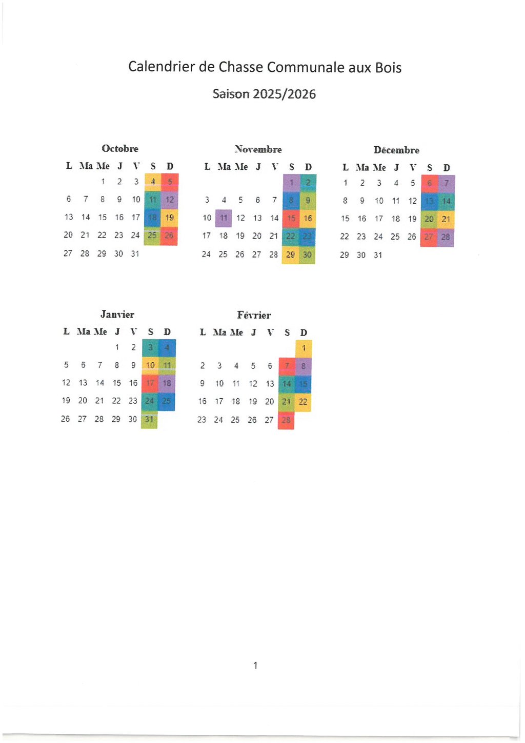 CALENDRIER DE CHASSE COMMUNALE AUX BOIS 2025-2026