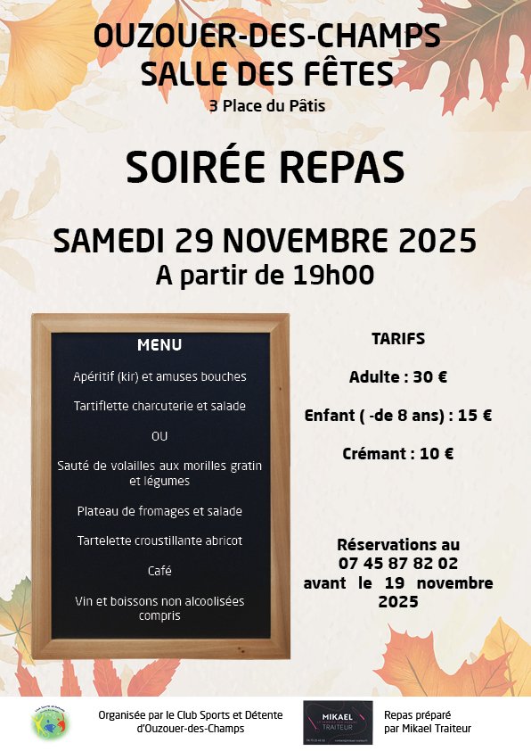 Le Club Sports et Détente organise une soirée repas le samedi 29 novembre 2025 à la salle des fêtes d'Ouzouer-des-Champs.