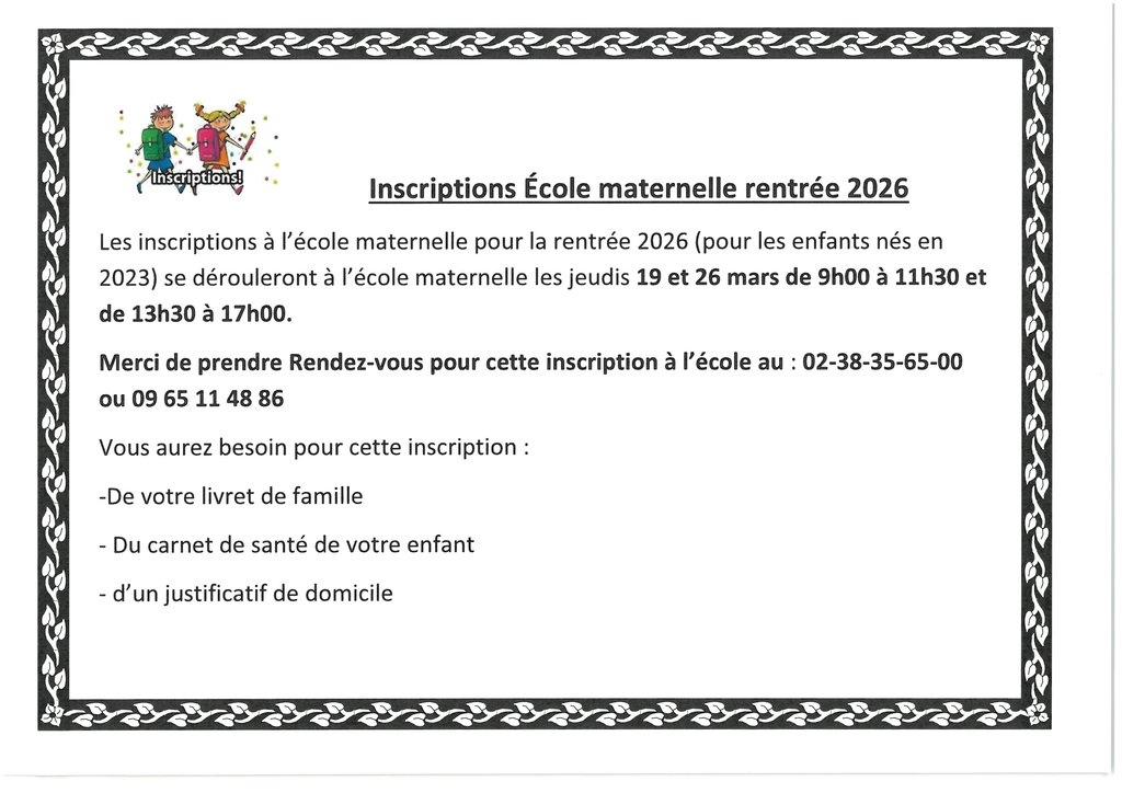 Prendre rendez-vous pour cette inscription à l'école au 02.38.35.65.00 ou 09.65.11.48.86