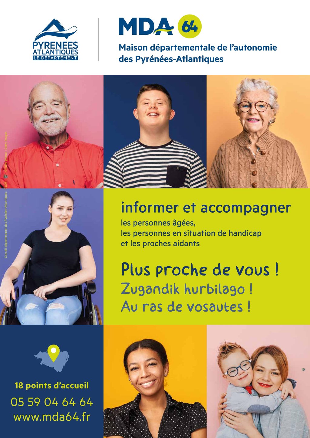 Vous pouvez désormais vous rendre dans l’un des 18 points d’accueil MDA présents sur notre territoire, composer le 05 59 04 64 64 ou consulter le site www.mda64.fr pour obtenir des renseignements sur les aides et les prestations.