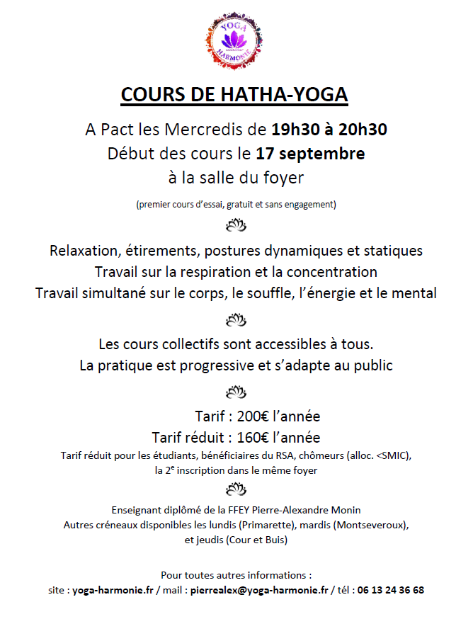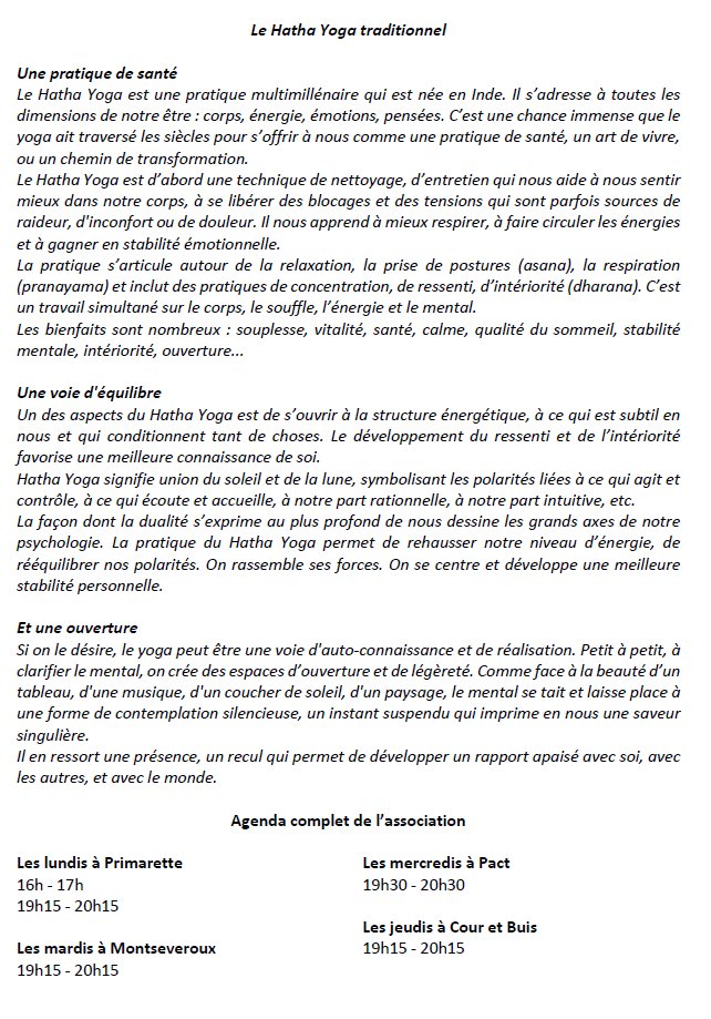Il existe plusieurs formes de yoga, allant du yoga simplement gymnique, doux ou très physique, au yoga méditatif. Le yoga enseigné est un Hatha Yoga traditionnel : le Nâtha Yoga. »