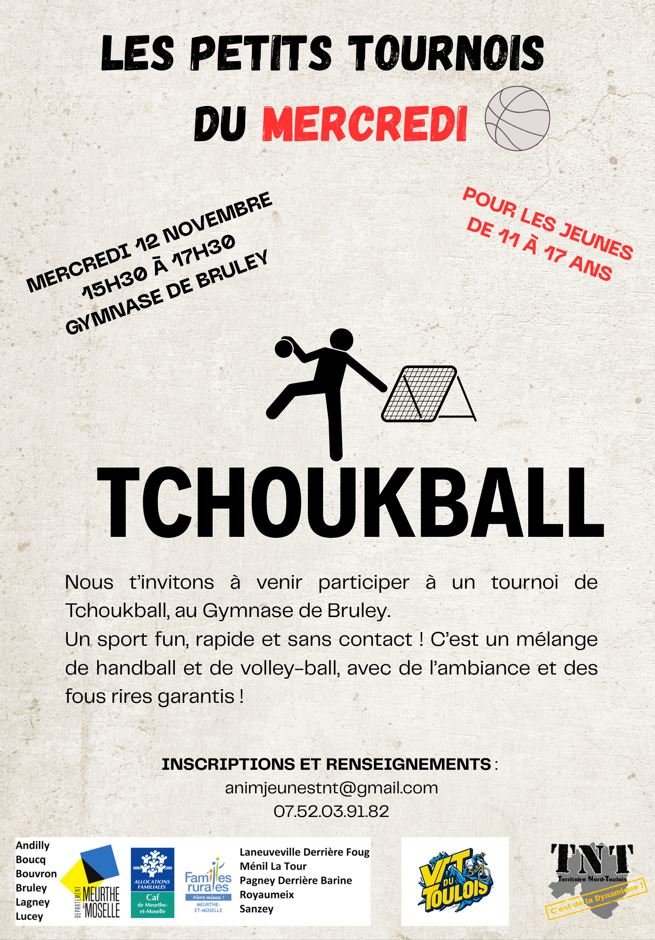 Nous t'invitons à venir participer à un tournoi de Tchoukball, au Gymnase de Bruley.