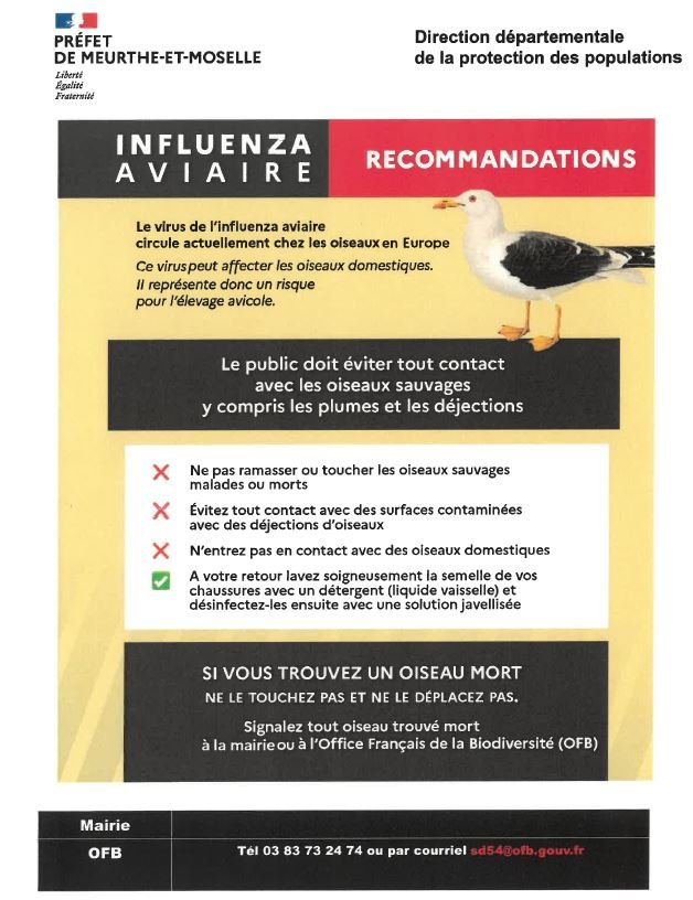 Le public doit éviter tout contact avec les oiseaux sauvages y compris les plumes et les déjections.