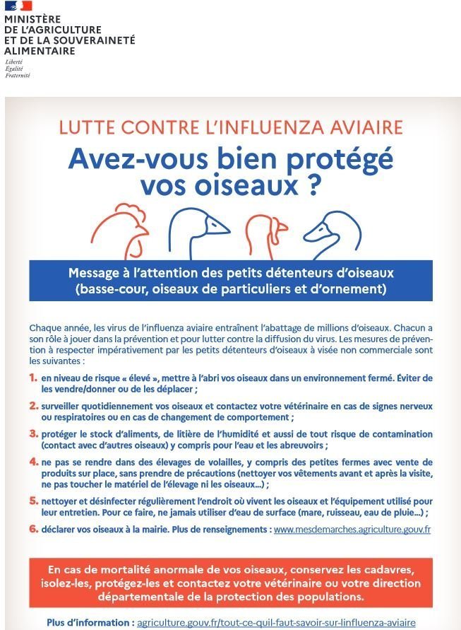 - https://agriculture.gouv.fr/influenza-aviaire-mesures-mettre-en-place-par-les-petits-detenteurs-doiseaux