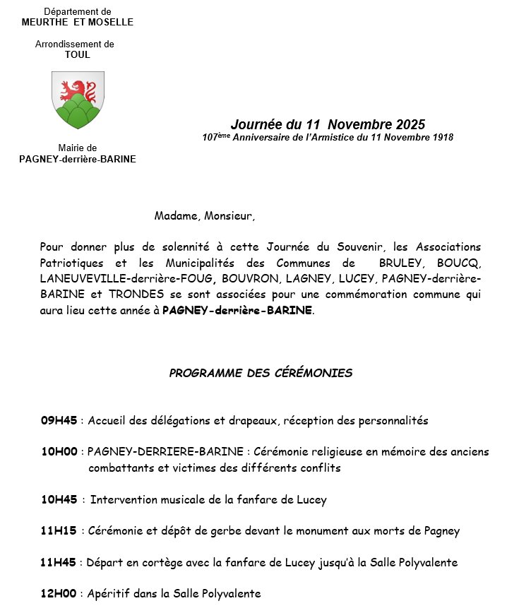 Pour donner plus de solennité à cette Journée du Souvenir, les Associations Patriotiques et les Municipalités des Communes de BRULEY, BOUCQ, LANEUVEVILLE-derrière-FOUG, BOUVRON, LAGNEY, LUCEY, PAGNEY-derrière-BARINE et TRONDES se sont associées pour une commémoration commune qui aura lieu cette année à PAGNEY-derrière-BARINE.