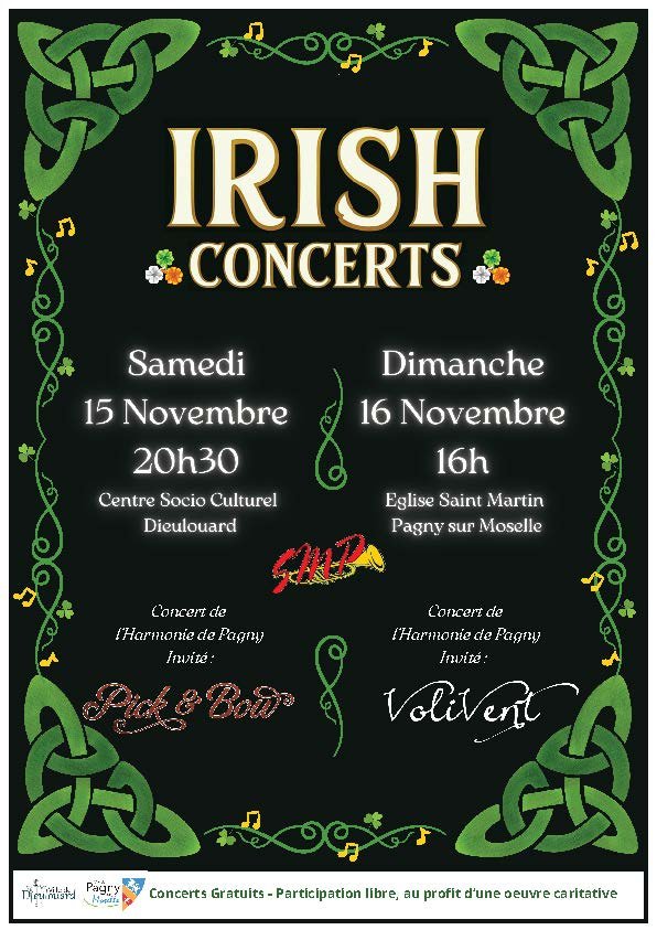 L’Harmonie de Pagny vous invite à deux concerts exceptionnels aux couleurs de l’Irlande, avec la participation des groupes Pick & Boat et Volivent :