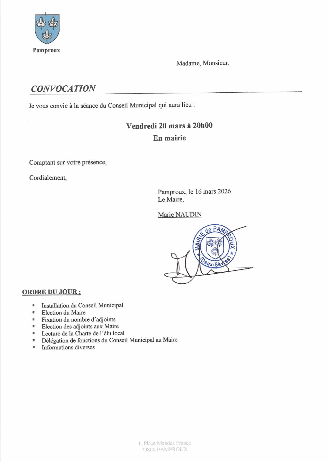 La prochaine séance du conseil municipal de Pamproux se tiendra en Mairie le :