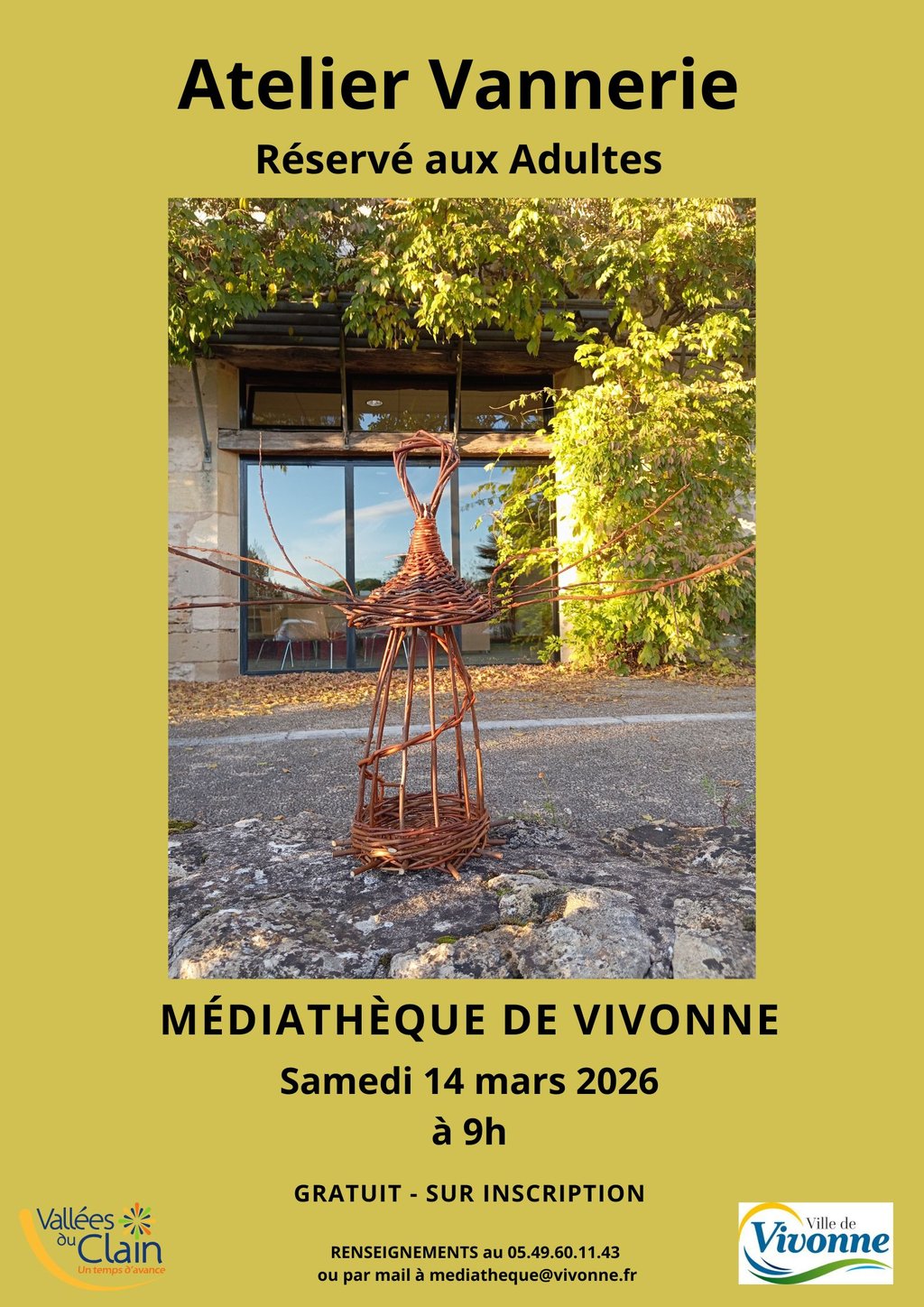 La médiathèque de Vivonne vous propose de découvrir l'art de la vannerie à travers un atelier animé par Michel Aubry, le samedi 14 mars de 9h à 12 h 30.