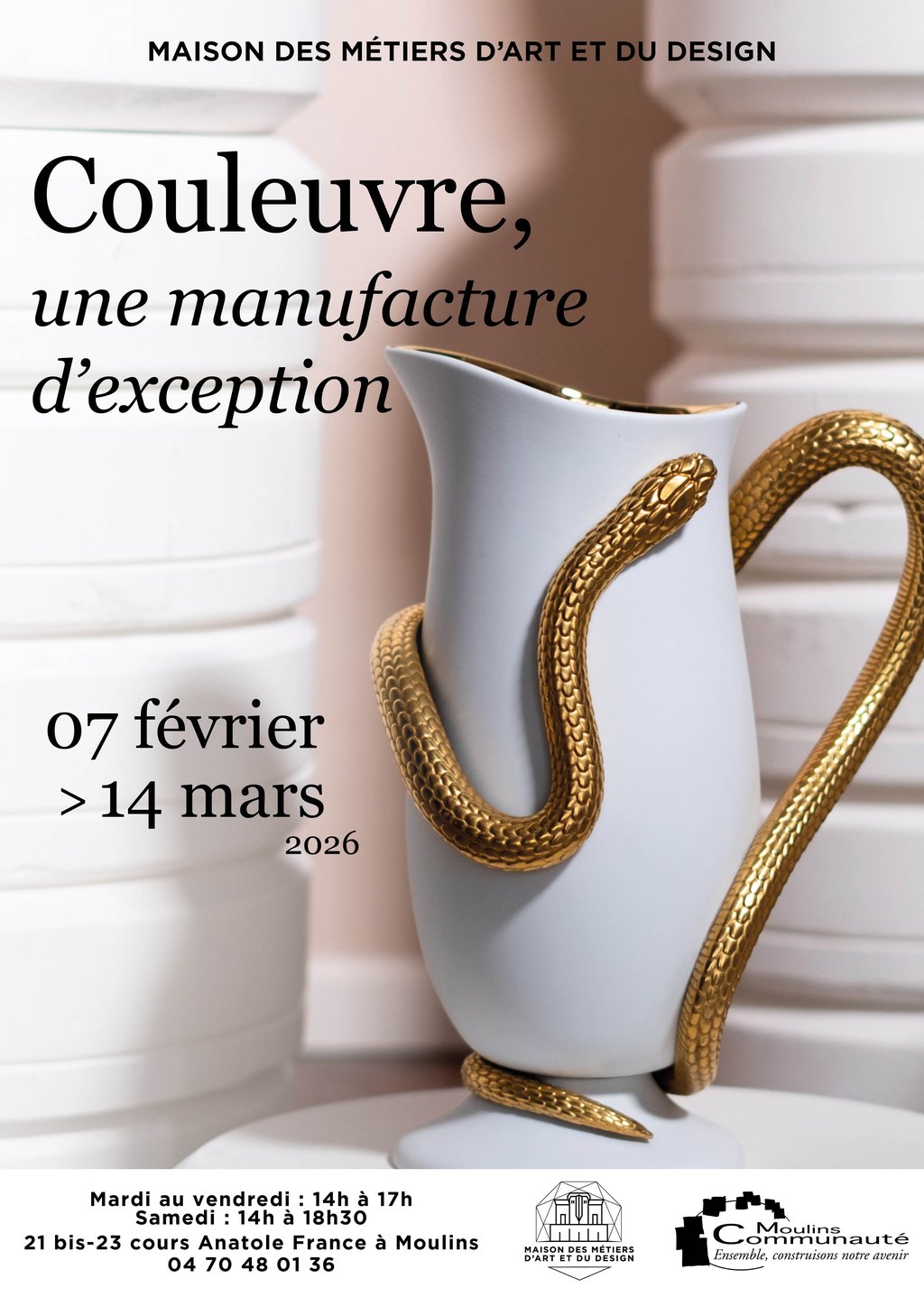 L’exposition est visible en accès libre du 7 février au 14 mars, du mardi au vendredi de 14h à 17h et le samedi de 14h à 18h30 , à la Maison des Métiers d’Art et du Design, 21 bis – 23 cours Anatole France 03000 Moulins.