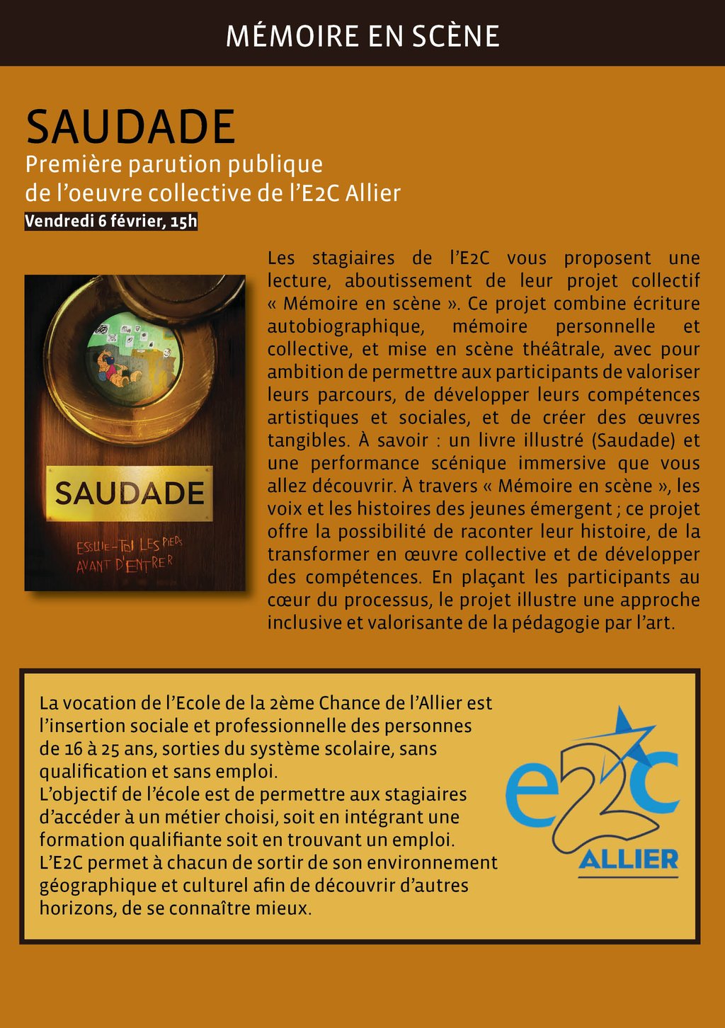 Les stagiaires de l’E2C vous proposent une lecture, aboutissement de leur projet collectif « Mémoire en scène ». Ce projet combine écriture autobiographique, mémoire personnelle et collective, et mise en scène théâtrale, avec pour ambition de permettre aux participants de valoriser leurs parcours, de développer leurs compétences artistiques et sociales, et de créer des œuvres tangibles. À savoir : un livre illustré (Saudade) et une performance scénique immersive que vous allez découvrir. À travers « Mémoire en scène », les voix et les histoires des jeunes émergent ; ce projet offre la possibilité de raconter leur histoire, de la transformer en œuvre collective et de développer des compétences. En plaçant les participants au cœur du processus, le projet illustre une approche inclusive et valorisante de la pédagogie par l’art.
