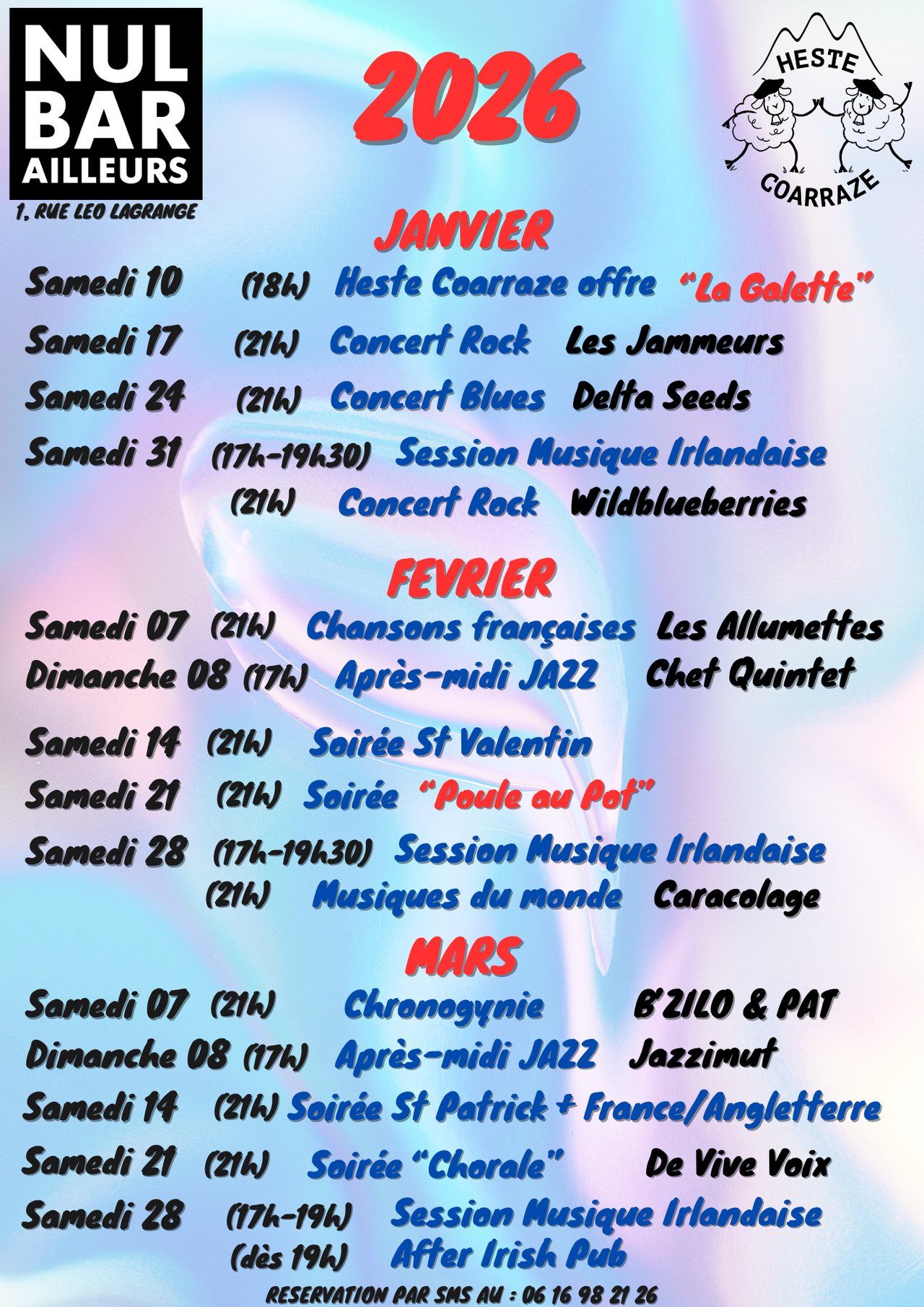 Voici le programme des animations au "Nul Bar Ailleurs" pour le 1ᵉʳ trimestre 2026.