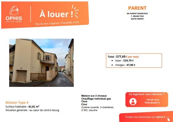 À Louer : Maison de bourg sur deux niveaux avec cour