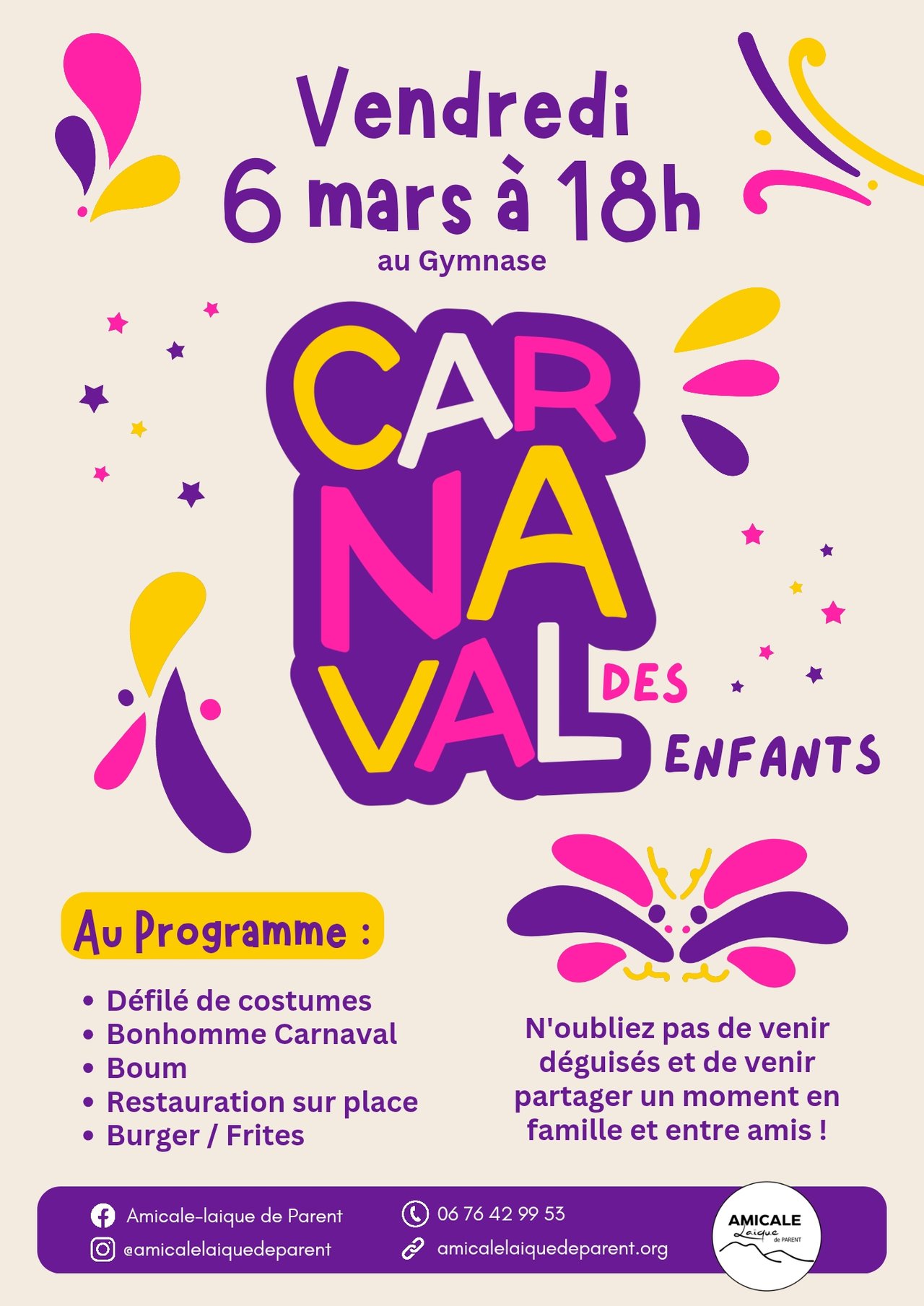 L’Amicale Laïque de Parent a le plaisir de vous inviter au Carnaval de l’école qui se tiendra le vendredi 6 mars à 18h au gymnase.