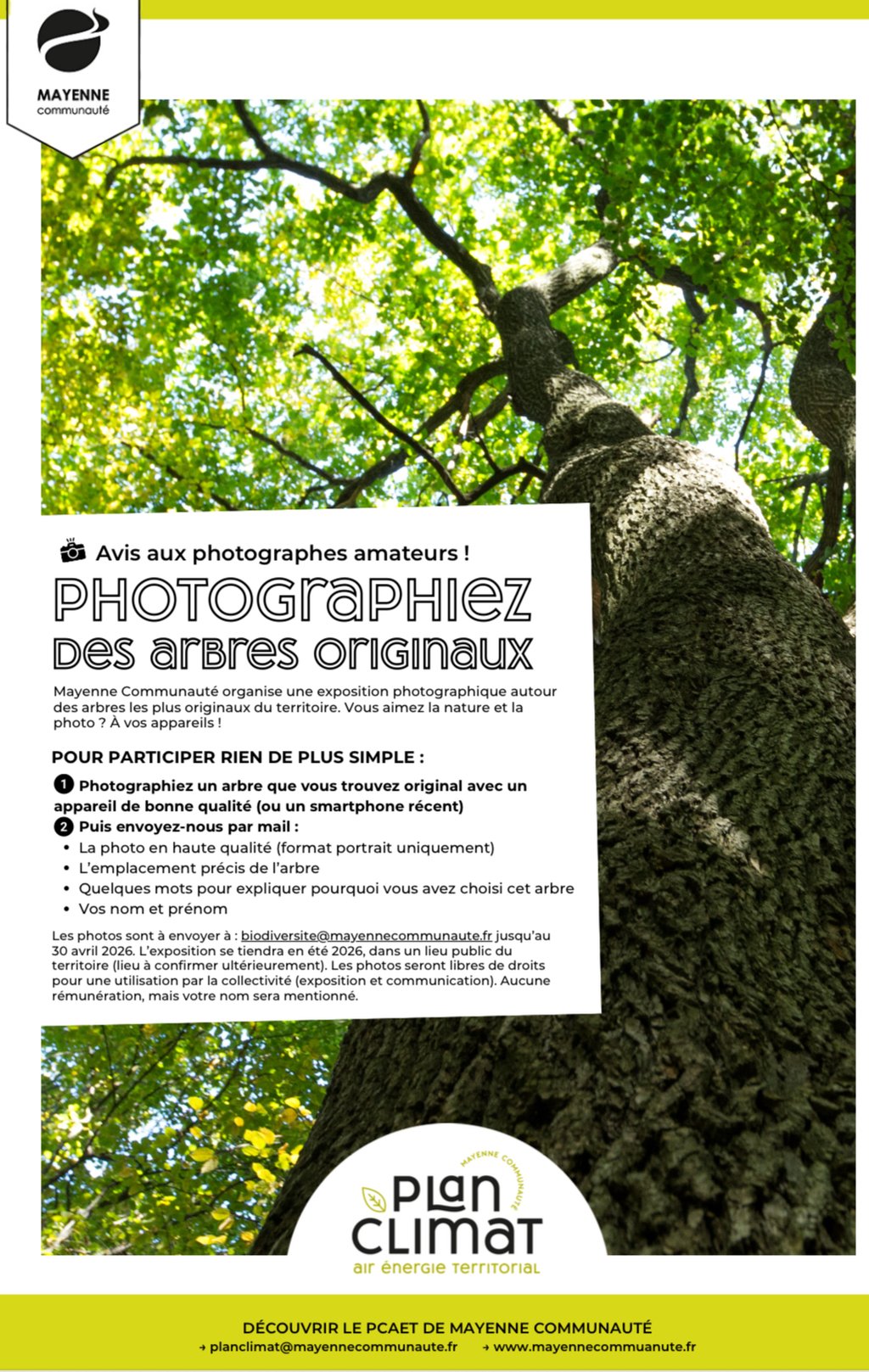 L’objectif est de mettre en valeur les arbres qui nous entoure et qui font de notre paysage un lieu d’exception. Tous les habitants de Mayenne Communauté peuvent exprimer leur attachement et leur regard sur le bocage ou les arbres isolés à travers une photo qu’ils enverront à : biodiversité@mayennecommunaute.fr avant le 30 avril 2026