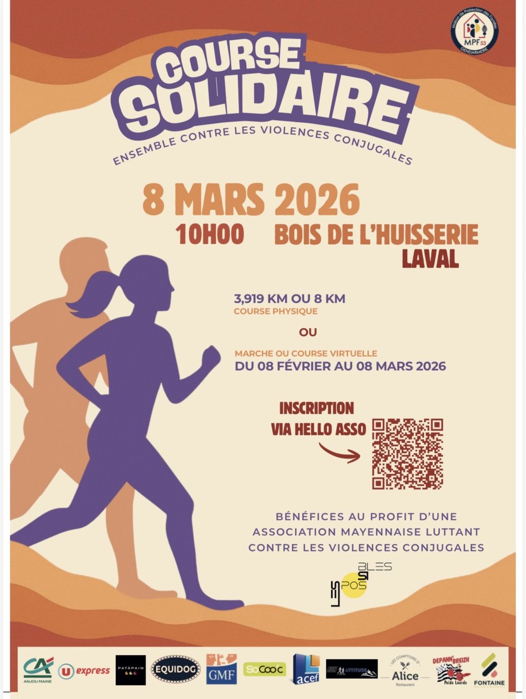 À l’occasion de la Journée internationale des droits des femmes, la Maison de Protection des Familles (MPF) du groupement de la gendarmerie départementale de la Mayenne organise une course solidaire le dimanche 8 mars 2026, au profit de l’association mayennaise Les Possibles, engagée dans l’accompagnement des victimes de violences conjugales.