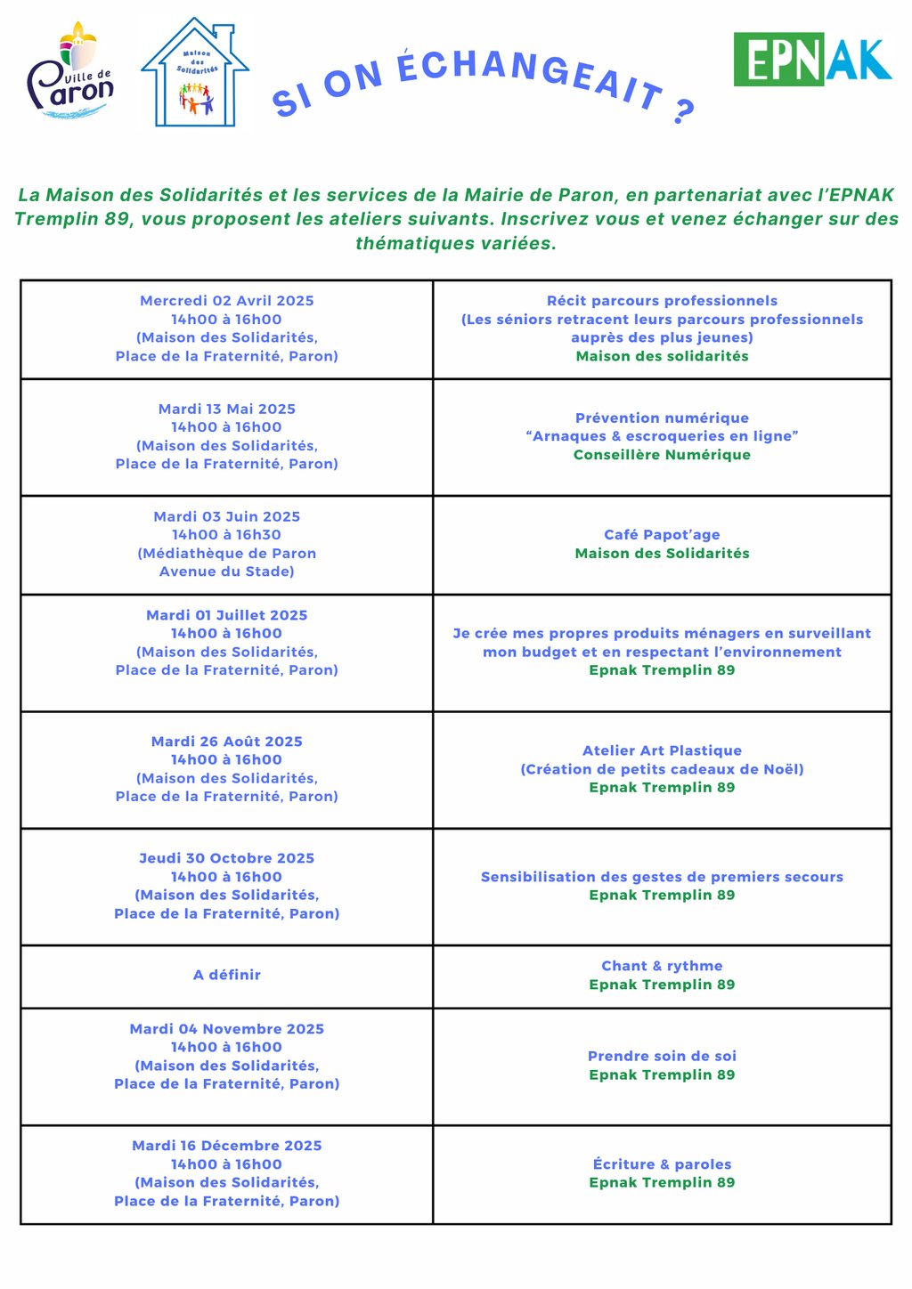La Maison des Solidarités et les services de la Mairie de Paron, en partenariat avec L’EPNAK Tremplin 89, vous proposent les ateliers suivants.
