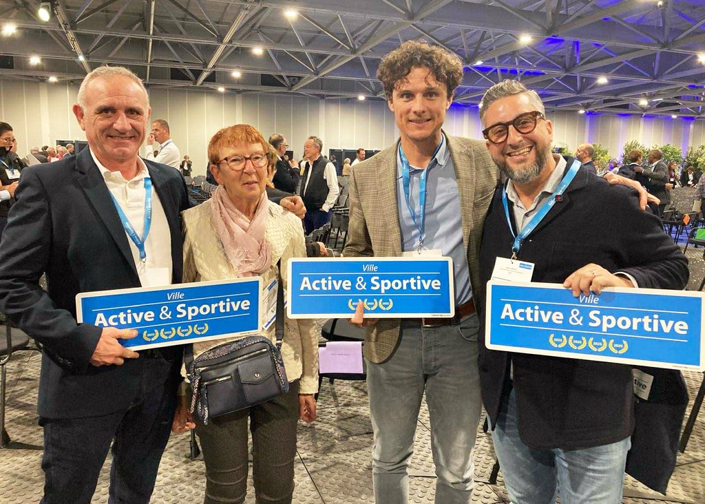"Ville Active et Sportive" pour Paron et Sens le jeudi 30 octobre à Nice. Paron accède au label 3 Lauriers et Sens confirme son label 4 Lauriers, la plus haute distinction. Les délégations composées d'Odile Imbert et Antoine Virey pour Paron, et Romain Crocco et Gérald Packo pour Sens se sont retrouvés pour immortaliser ce moment. Et un grand Merci au président du Conseil Départemental Grégory Dorte qui est venu soutenir en personne ces récompenses décernées au territoire e l'Yonne.