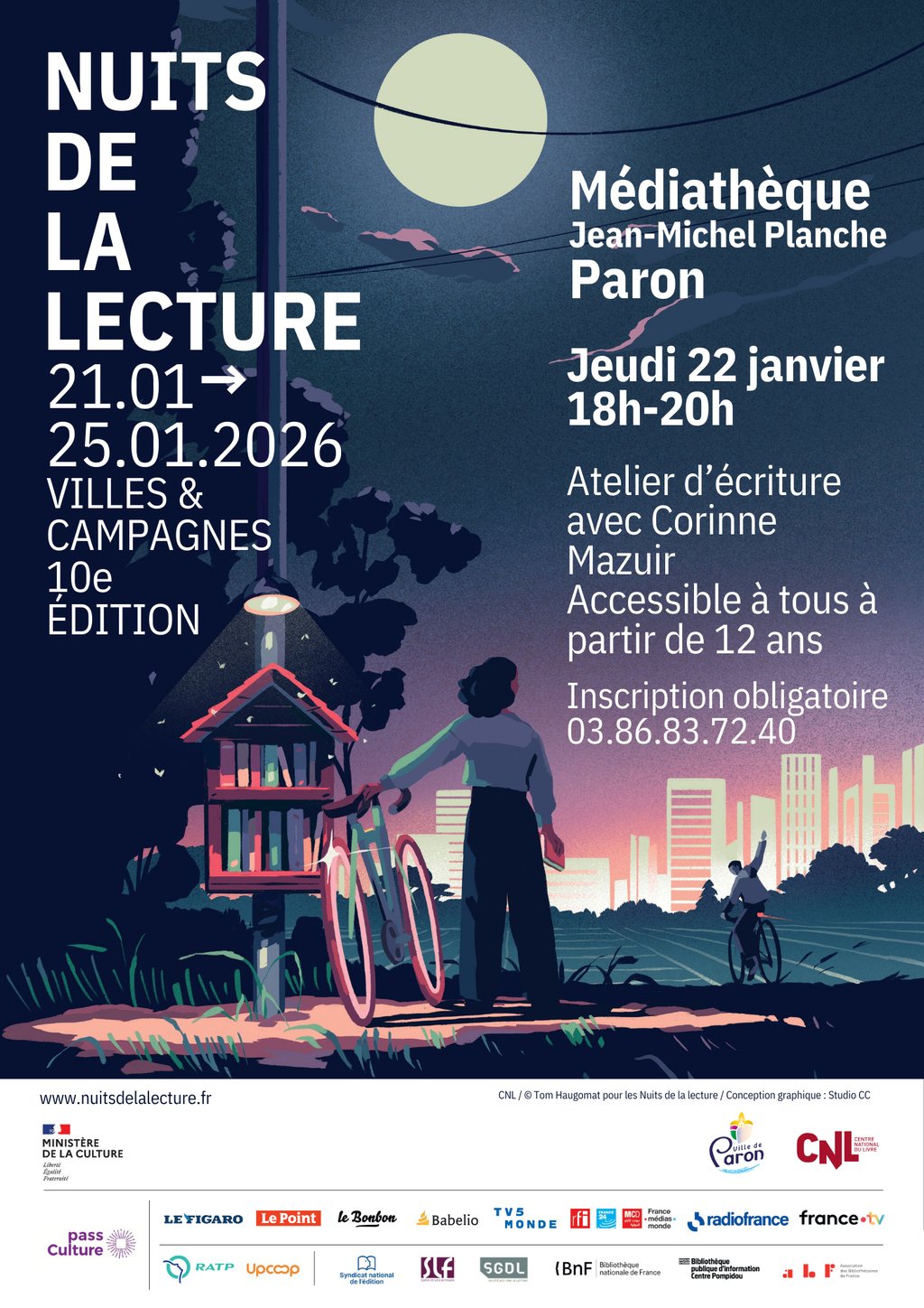 Dans le cadre des Nuits de la lecture, la médiathèque de Paron propose un atelier d'écriture pour adultes et enfants à partir de 12 ans, le jeudi 22 janvier de 18h à 20h.