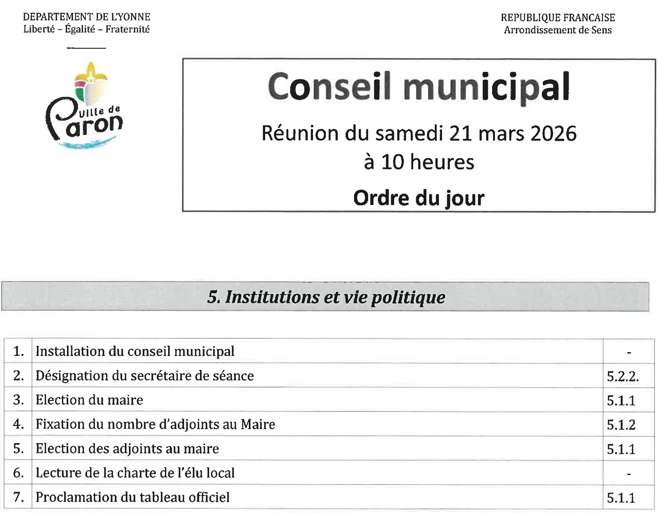 CONSEIL MUNICIPAL LE SAMEDI 21 MARS 2026