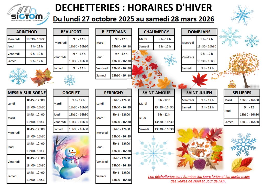 ❄⛄ DÉCHETTERIES - HORAIRES HIVER 27 OCTOBRE - 28 MARS ❄⛄