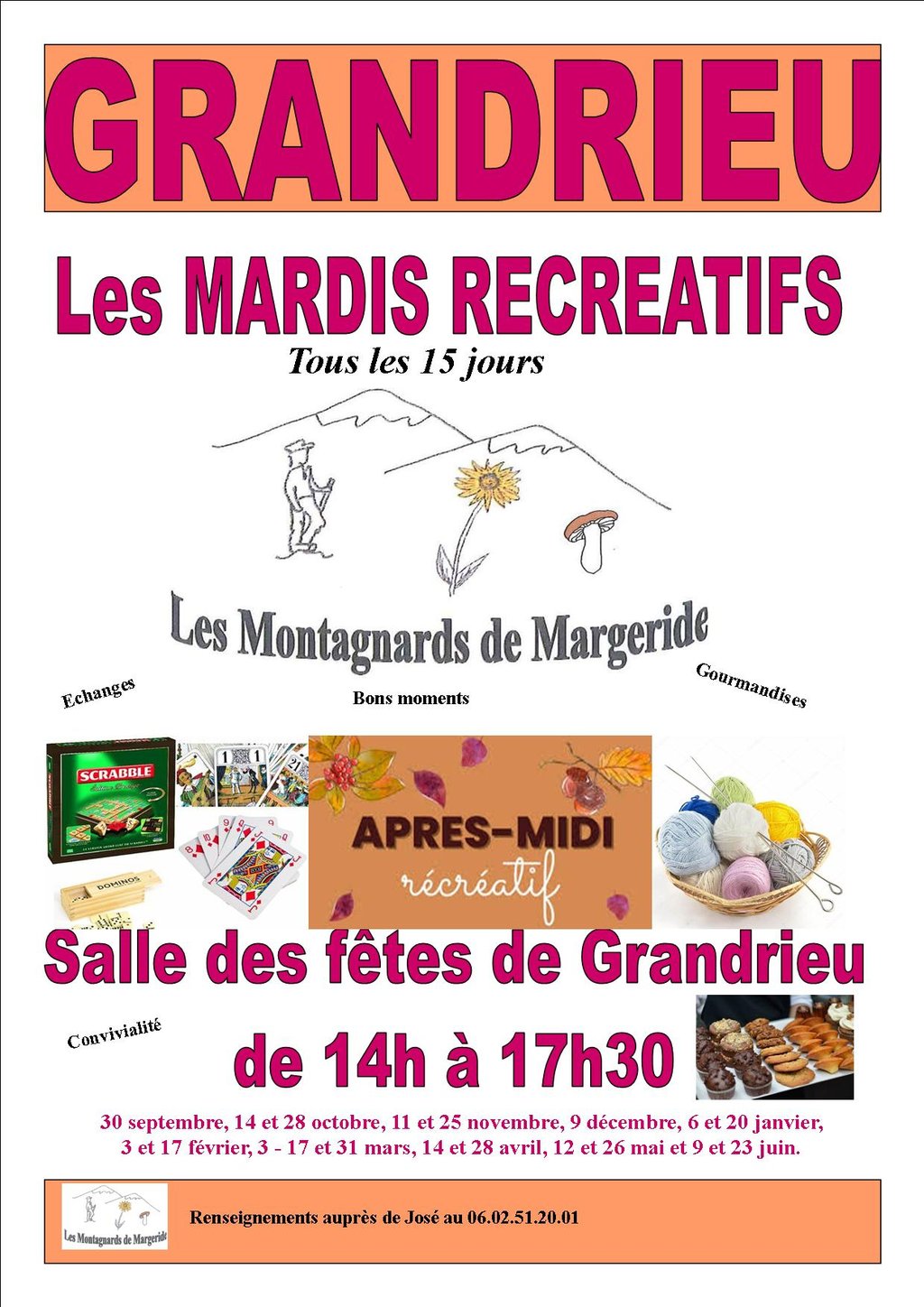 L'association Les Montagnards de Margeride organise des après-midis récréatifs, les mardis tous les 15 jours, à partir de 14h à la salle des fêtes de Grandrieu