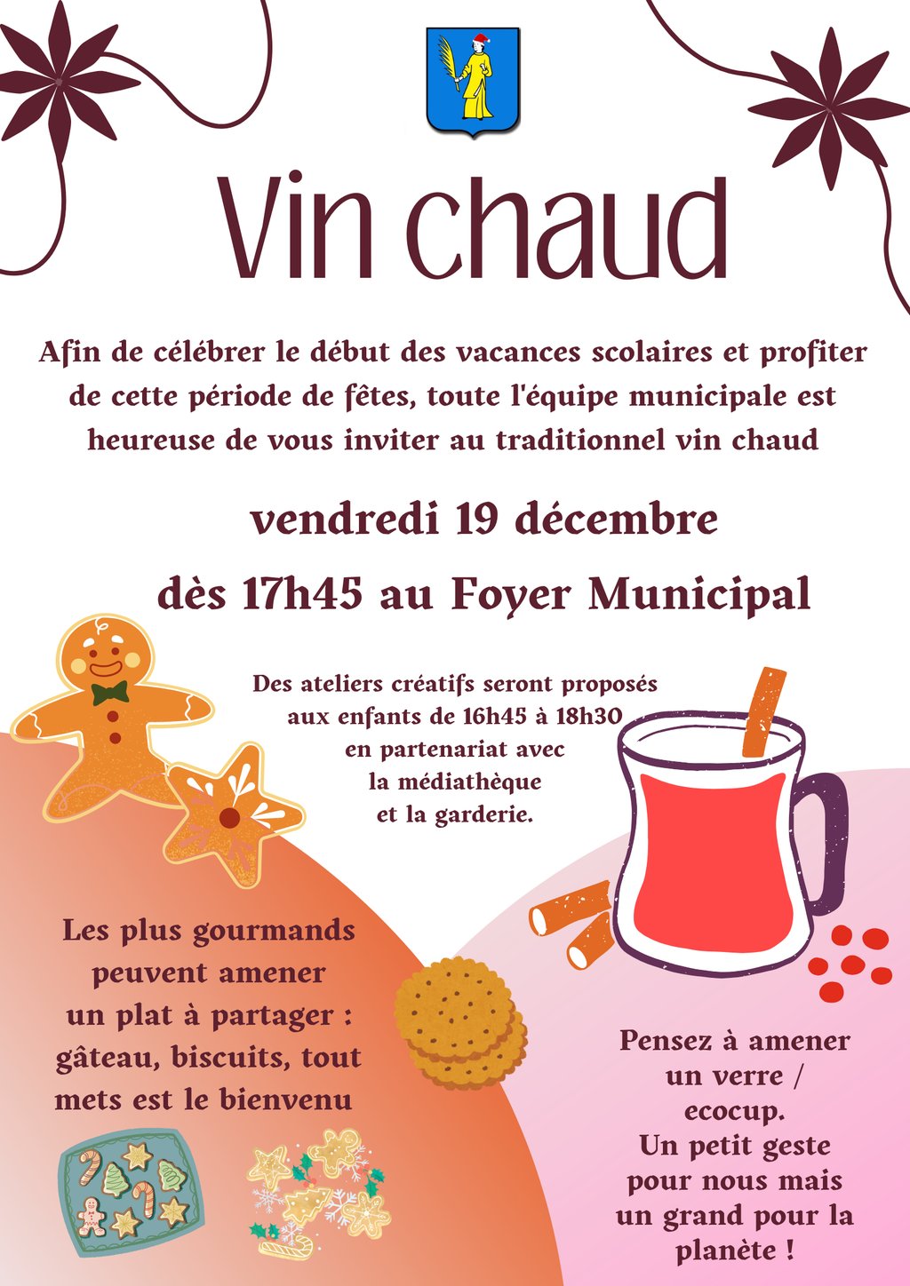 Afin de célébrer le début des vacances scolaires et profiter de cette période de fêtes, toute l'équipe municipale est heureuse de vous inviter au traditionnel vin chaud. Celui-ci se déroulera ce vendredi 19 décembre à 17h45 au Foyer municipal (place de la Mairie) 🎉