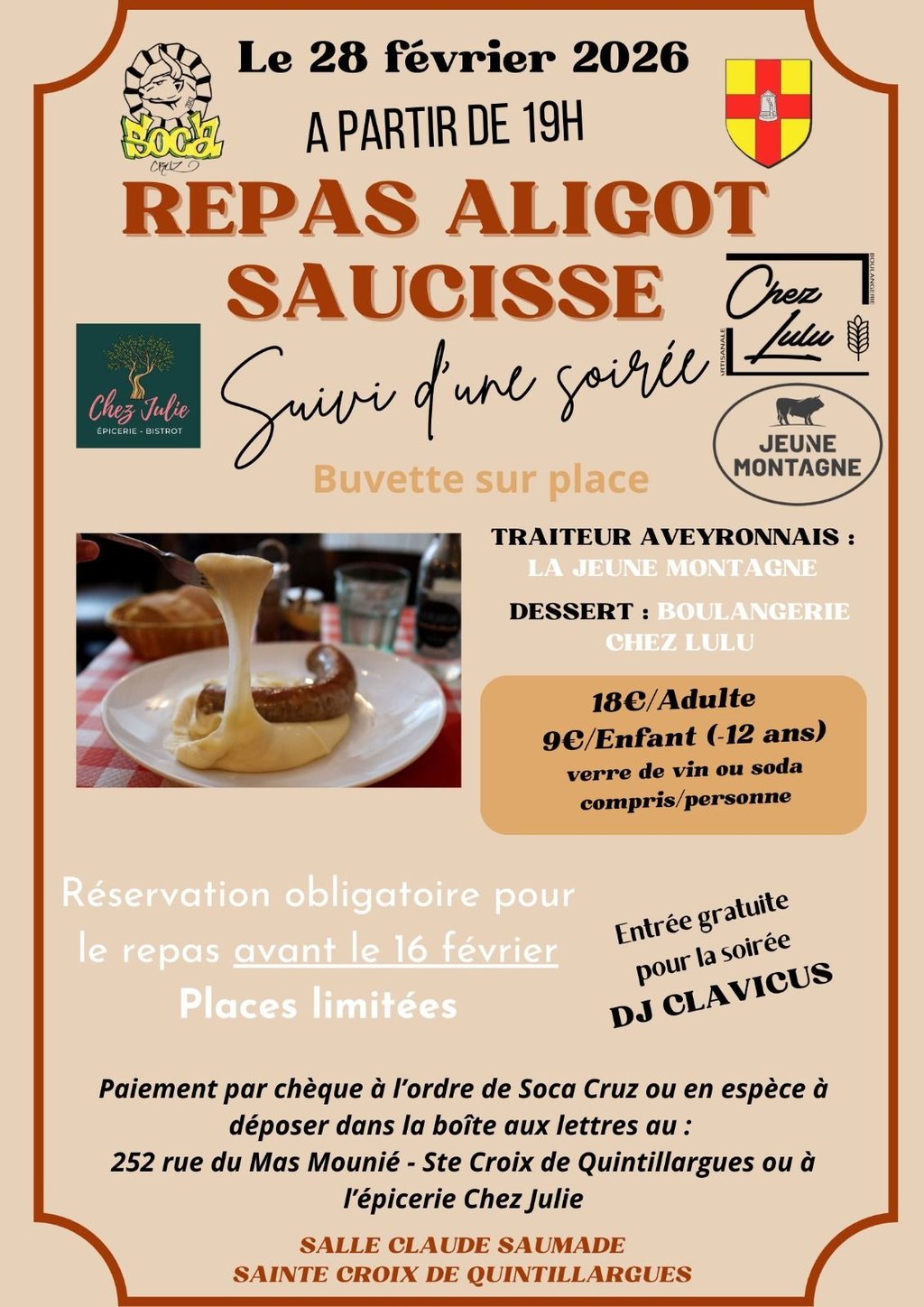 Pour des questions de disponibilité de traiteur, la soirée Aligot Saucisse a finalement lieu le 28 février !!