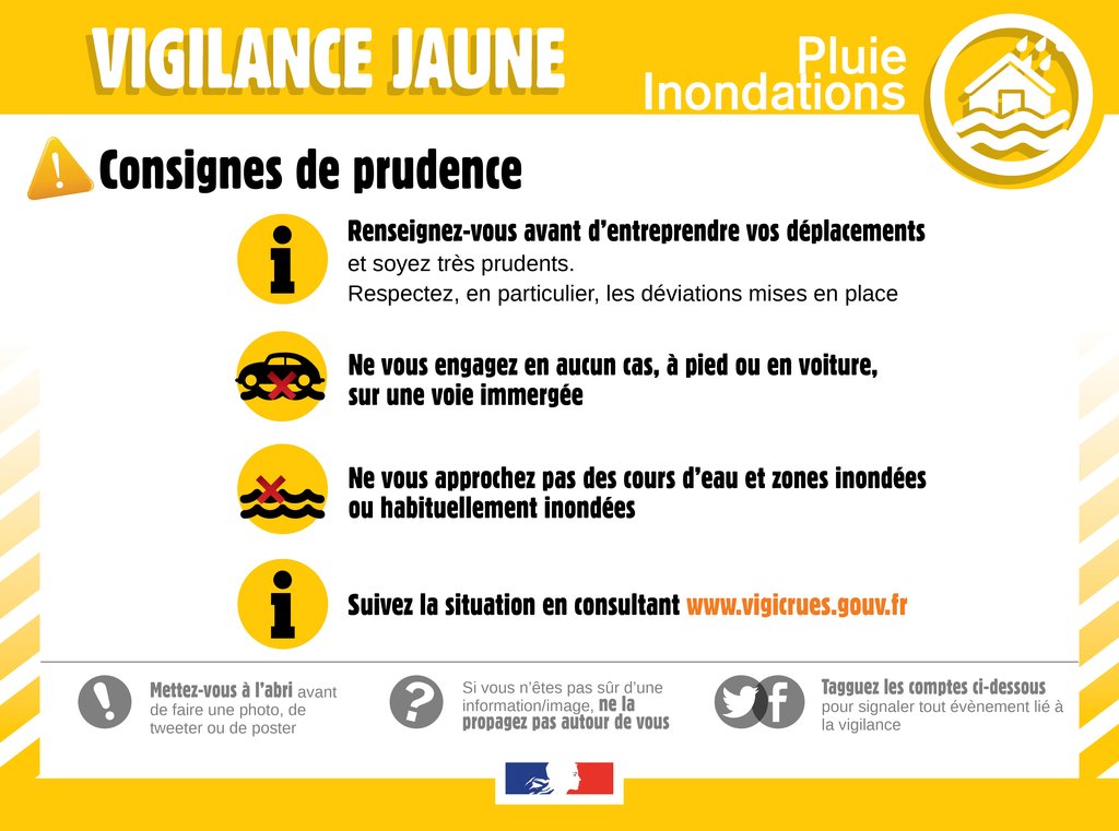 Tenez-vous informé de la situation. Soyez vigilant si vous vous situez à proximité d'un cours d'eau ou d'une zone habituellement inondable. Conformez-vous à la signalisation routière.