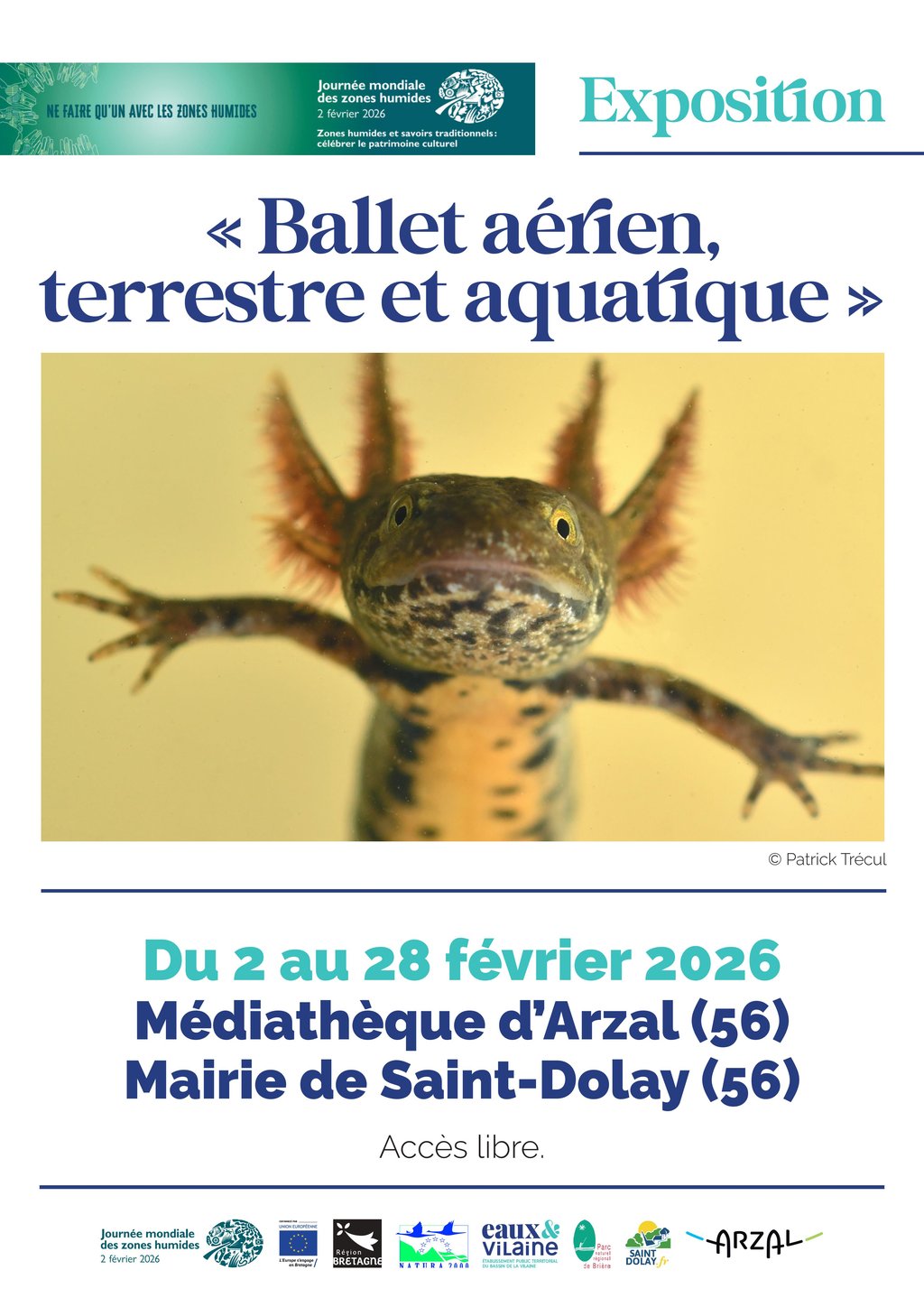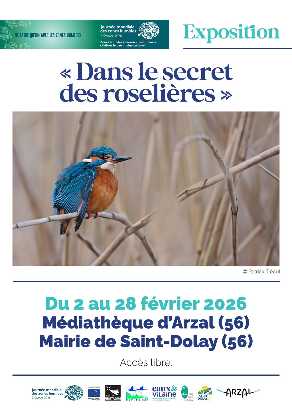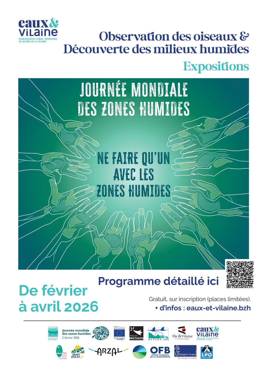 À l'occasion de la Journée Mondiale des Zones Humides, l'établissement public "Eaux & Vilaine" vous invite à découvrir son programme d'animations organisées : des sorties de découverte des oiseaux et de sensibilisation aux fonctions naturelles des milieux humides, ainsi qu'une exposition sur la biodiversité de nos territoires.