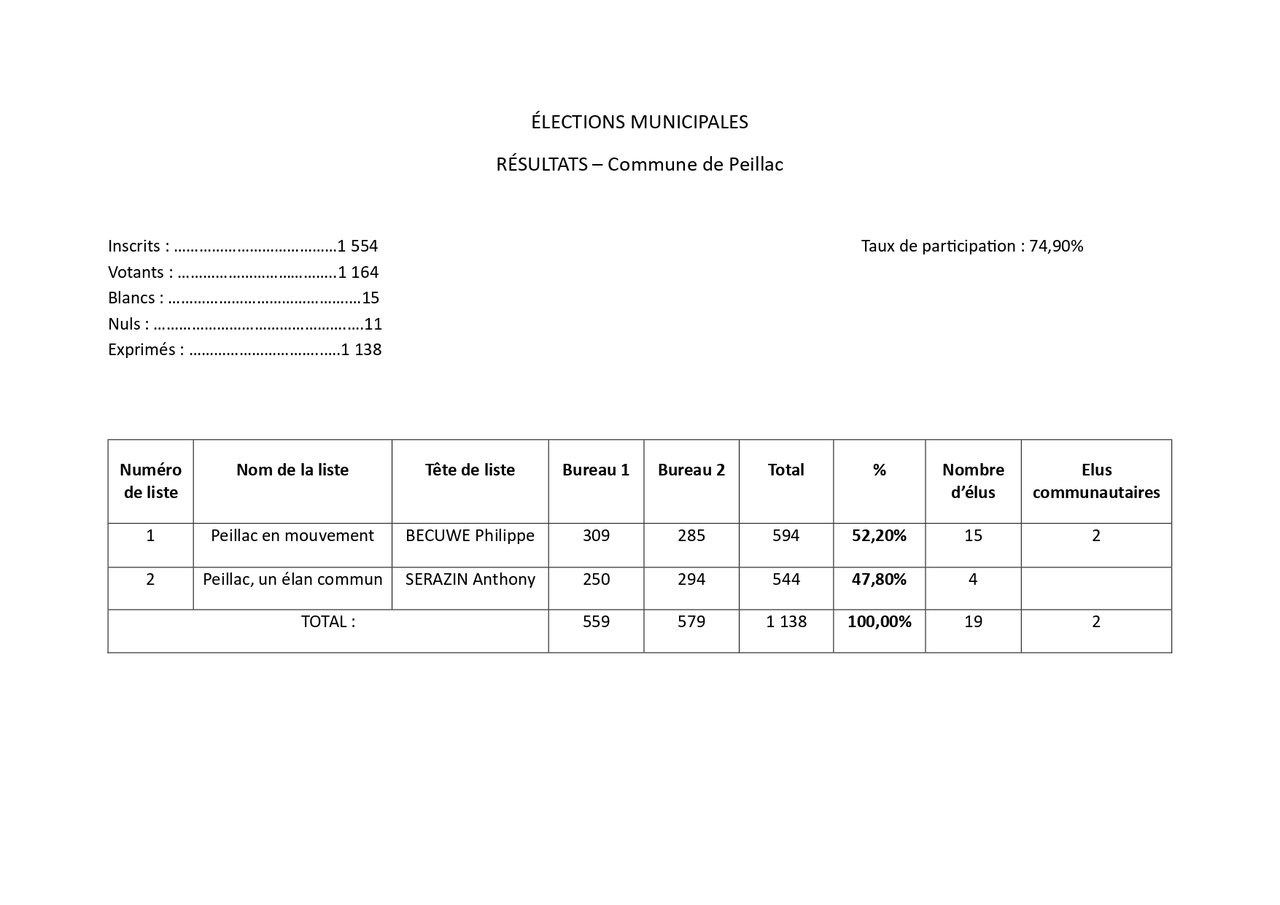 Pour votre information, voici les résultats des élections municipales du dimanche 15 mars 2026.