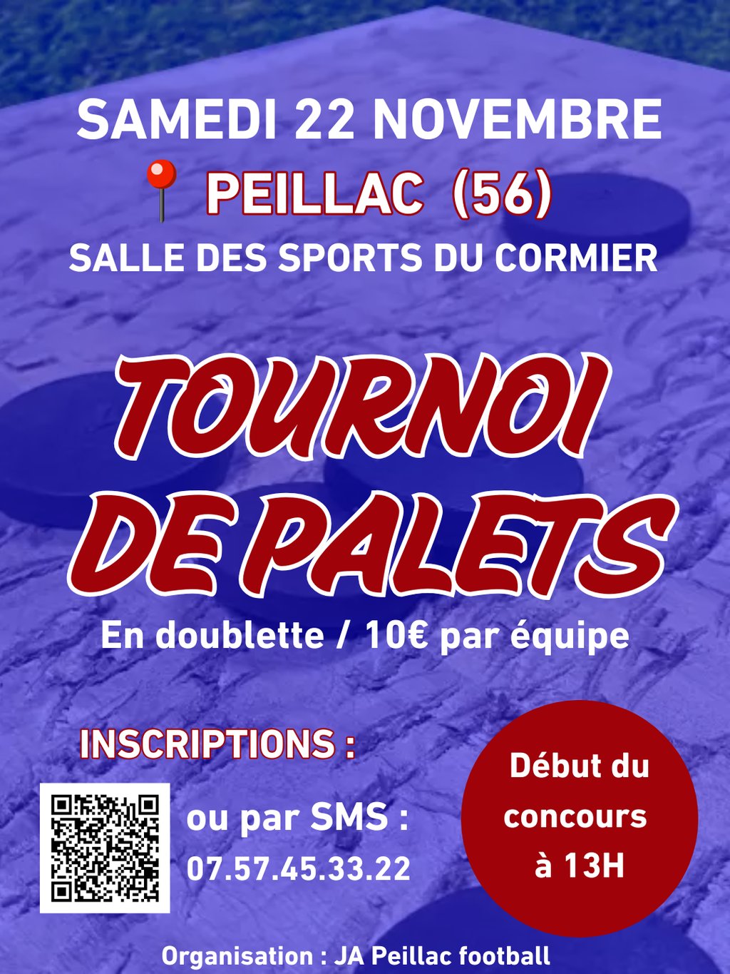 🖍️ Inscriptions : https://www.helloasso.com/associations/ja-peillac/evenements/concours-de-palets-2025 OU par SMS au 07.57.45.33.22