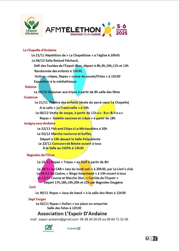 Retrouvez ci-dessous toutes les manifestations organisées par l'Association L'Espoir d'Andaine au profit du Téléthon.
