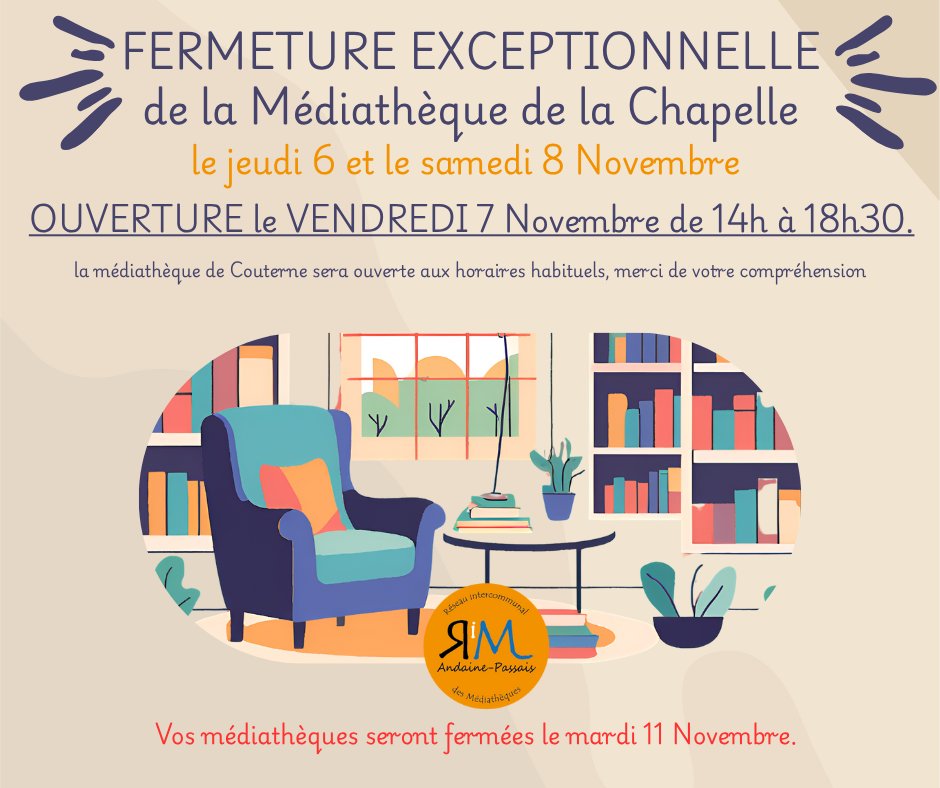 FERMETURE EXCEPTIONNELLE - MÉDIATHÈQUE DE LA CHAPELLE - JEUDI 6 NOV ET SAMEDI 8 NOV.