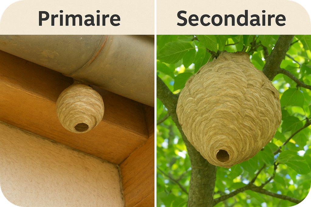 Puis, au cours de lâĂ©tĂ© et de lâautomne, les colonies se dĂ©veloppent et bĂątissent des nids secondaires, beaucoup plus grands â parfois de la taille dâun ballon de foot ou davantage â contenant des centaines, voire des milliers de frelons.