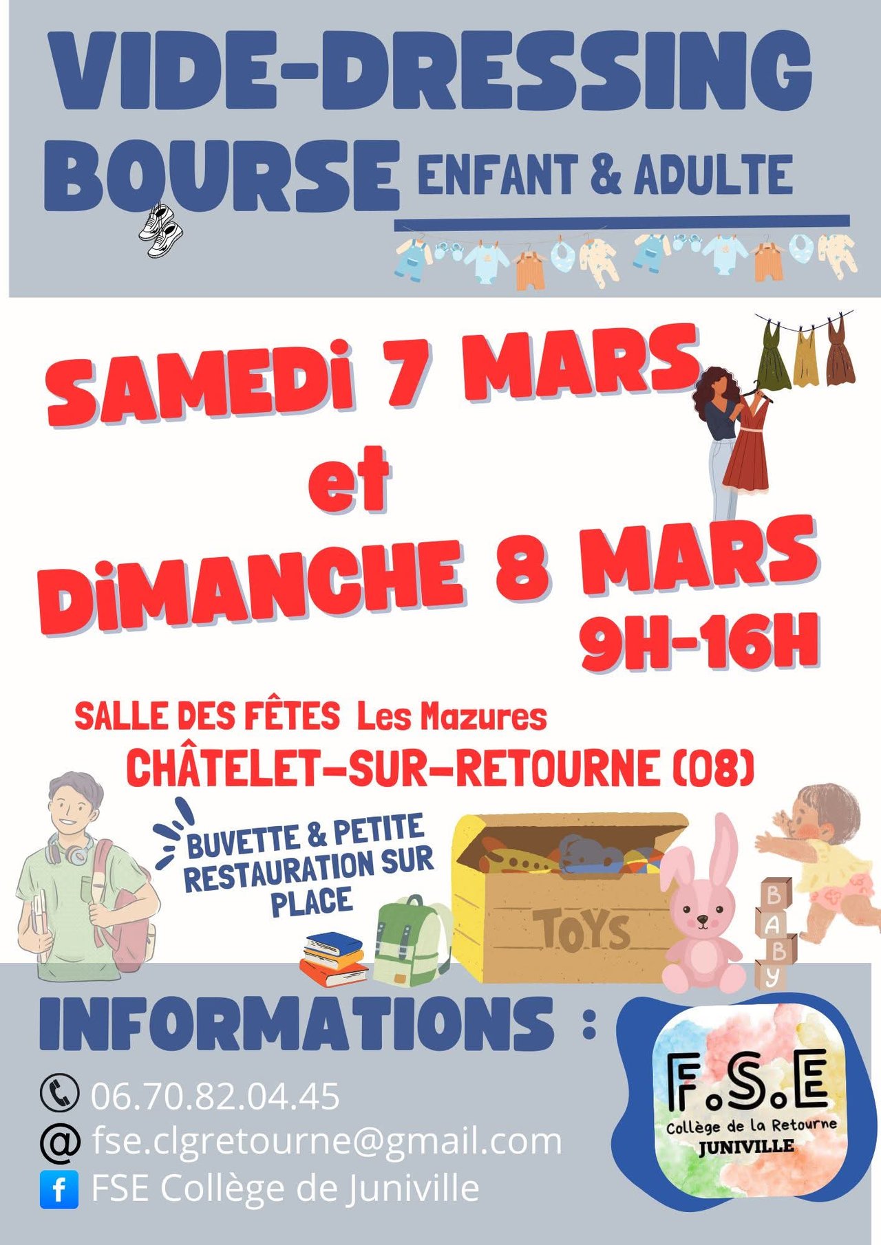 Le Foyer Socio-éducatif du collège de Juniville organise un vide dressing le samedi 7 mars et le dimanche 8 mars 2026 de 9h à 16h à la salle des fêtes du Chatelet-sur-Retourne.