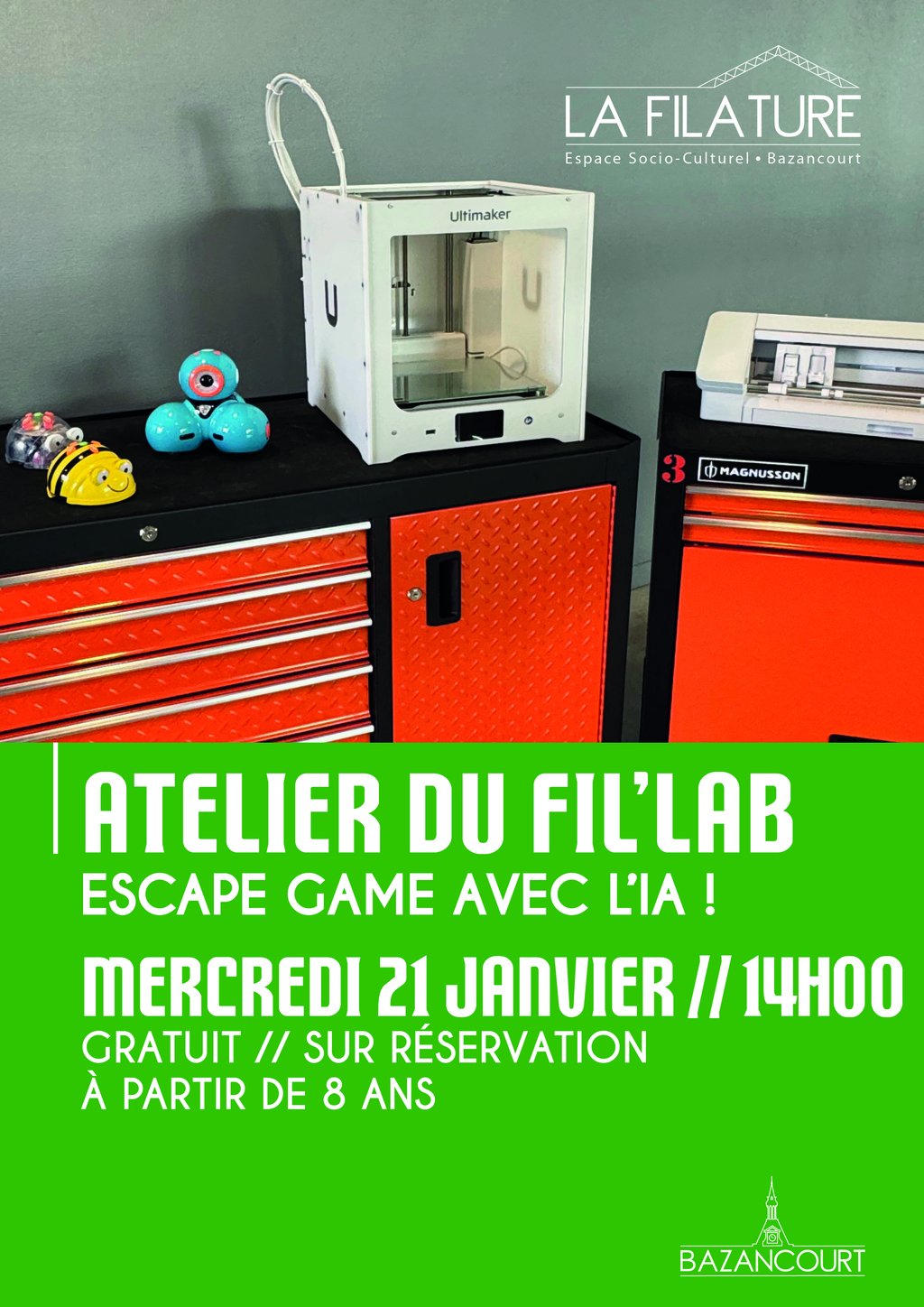 Le Fil’Lab est également mis à disposition le samedi matin et un vendredi après-midi par mois. Le règlement et les conditions de réservation sont disponibles auprès de l’accueil.