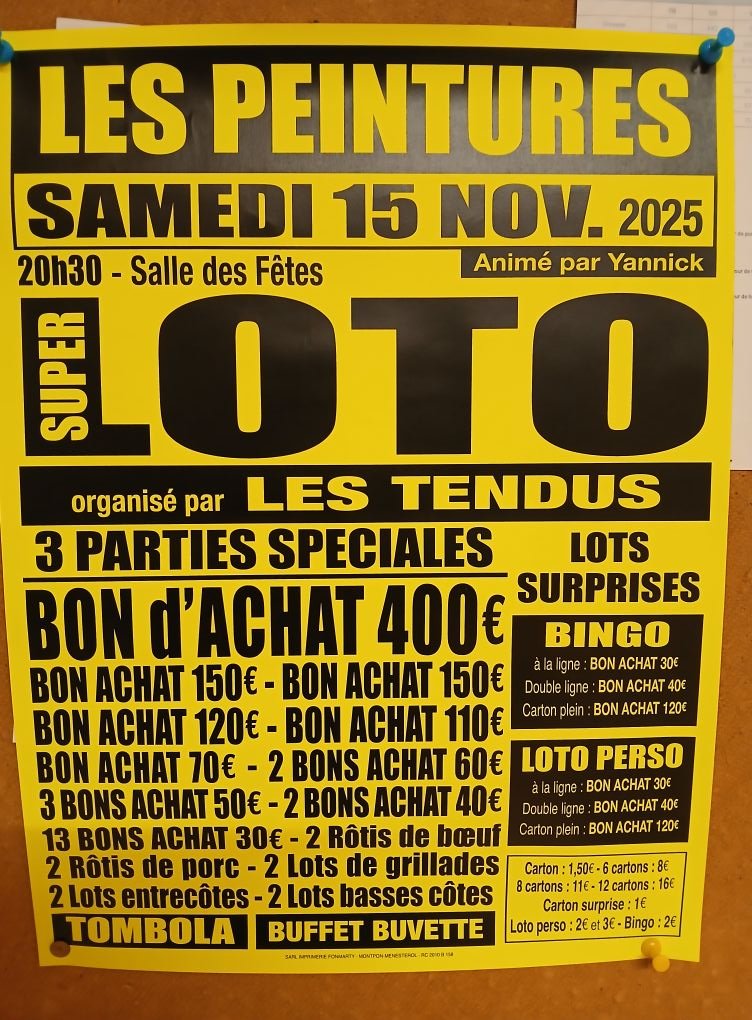 L'association Les Tendus 2008 organise un loto le samedi 15 novembre 2025 à la salle des fêtes.