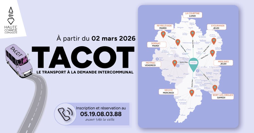 Le 2 mars, Haute-Corrèze Communauté lance le Tacot, un service de transport à la demande pensé pour faciliter vos déplacements quotidiens sur l’ensemble du territoire.