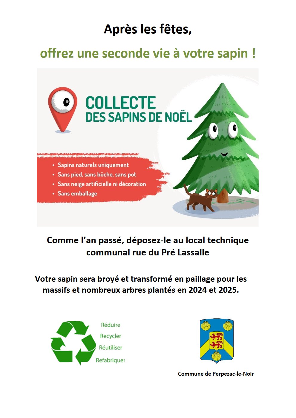 Vous pouvez déposer vos sapins naturels dans la zone dédiée à côté du local technique des ateliers municipaux, rue du Pré Lassalle, afin qu'il soit collecté par les agents qui le broieront pour en faire du paillage pour les massifs de la commune.