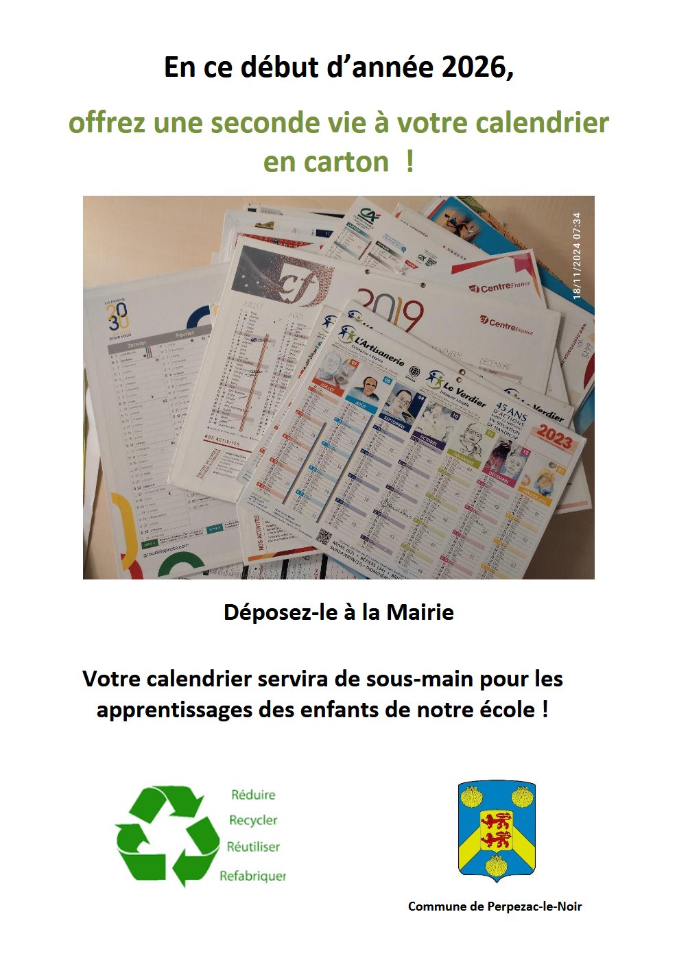 Pour faire des sous-mains aux enfants de notre école, la mairie collecte vos vieux calendriers en carton