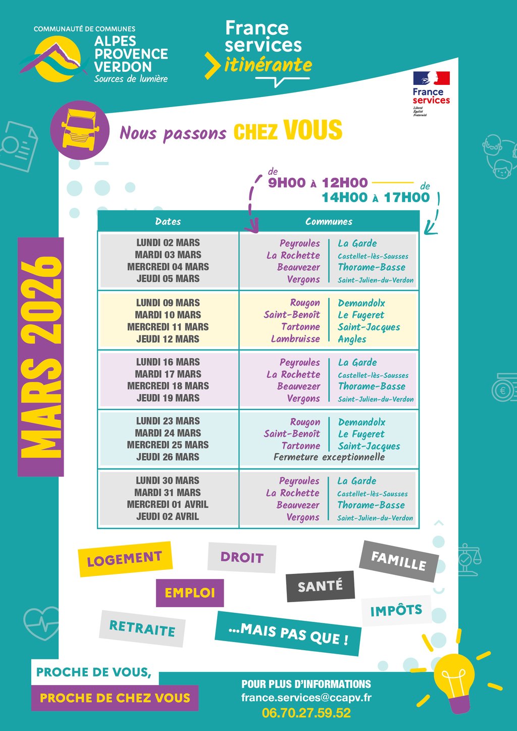 La nouvelle tournée de la France Services itinérante de la CCAPV pour le mois deMArs 2026.