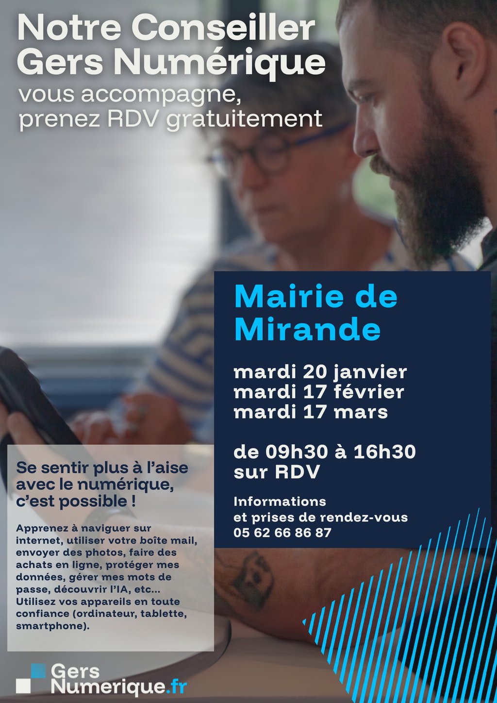 📍 Le conseiller Gers Numérique se déplace au plus près de chez vous pour vous accompagner gratuitement et individuellement sous forme d'atelier.