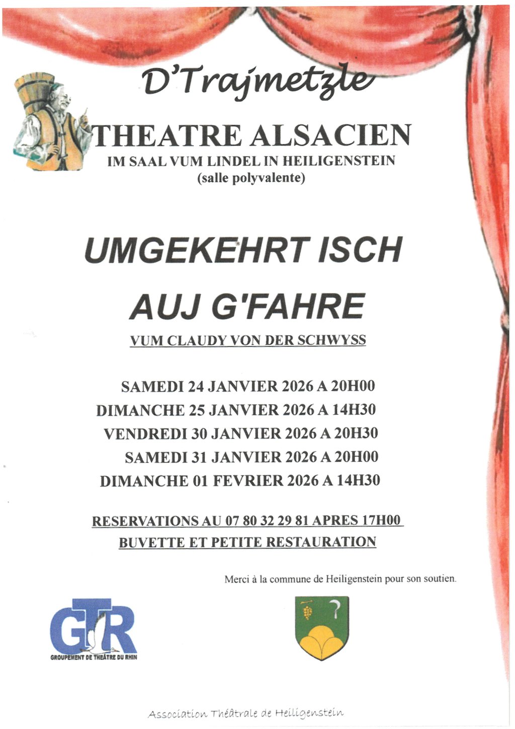 D’Trajmetzle vous invitent à découvrir leur nouvelle pièce de théâtre alsacienne : une comédie savoureuse signée Claudy von der Schwyz.Rires et bonne humeur garantis !Ouverture des portes : 30 minutes avant la représentation.Informations et réservation au 07.80.32.29.81 après 17 h 00