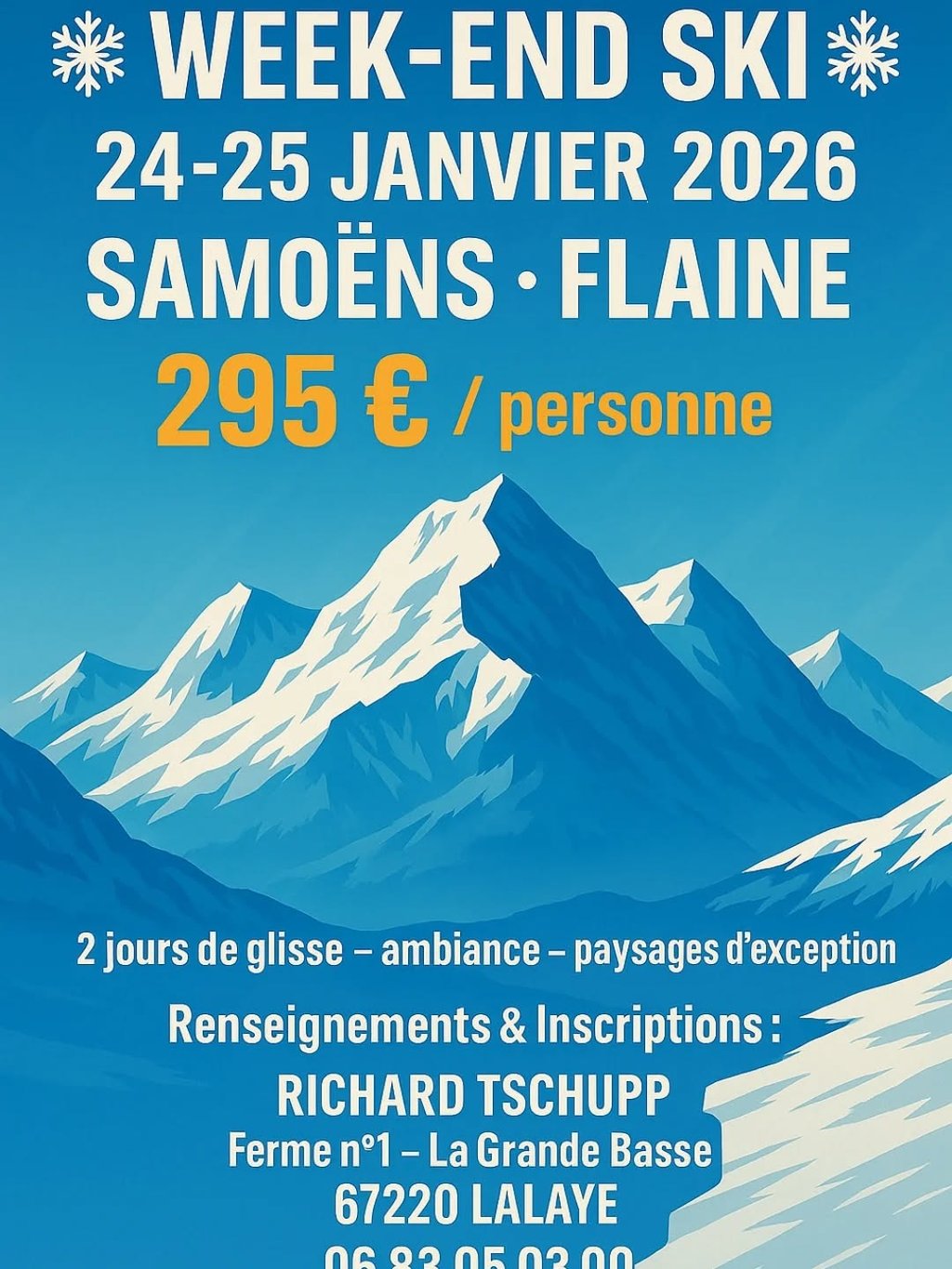 Le ski club Molsheim Mutzig vous propose un week end de détente à ski ou snowboard sur les 265 km de pistes du Grand massif qui regroupe 5 stations : Flaine – Les Carros – Morillon – Samoëns et Sixt Fer à Cheval. Le sommet des pistes culmine à 2500 m d’altitude avec une extraordinaire vue sur le Mt Blanc. si bon enneigement, possibilité de descendre la piste des cascades (13 km de pistes qui mené directement à l'hotel); Week end du 24 et 25 janvier 2026
