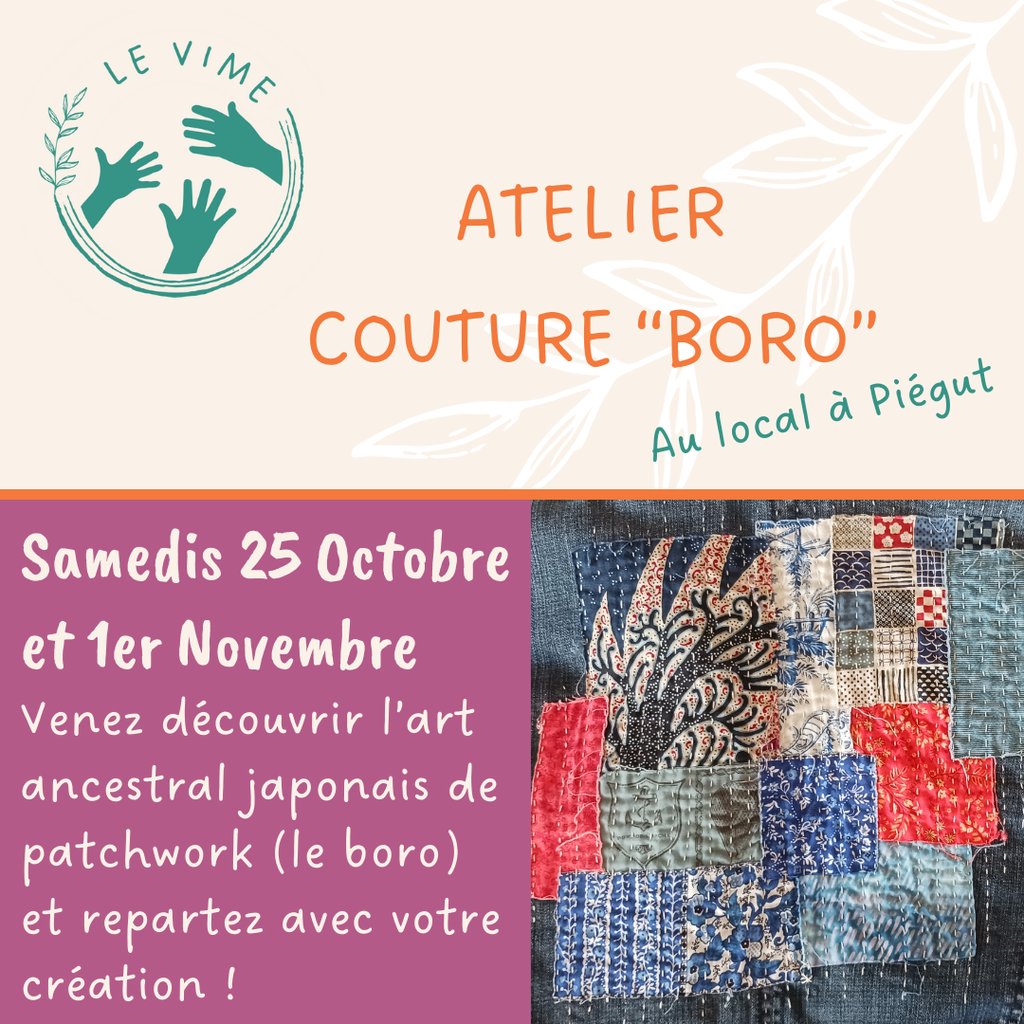 Annick vous propose de découvrir l'art ancestral du patchwork japonais appelé Boro. En deux ateliers de 2 heures, vous repartirez avec le porte-aiguille que vous aurez confectionné, et la connaissance d'une nouvelle technique de couture.