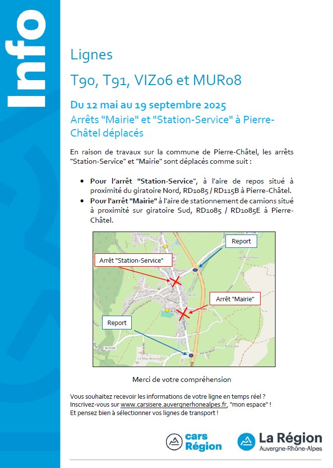 En raison de travaux sur la commune de Pierre-Châtel, les arrêts "Station-Service" et "Mairie" sont déplacés pendant toute la période des travaux du 12 mai au 19 septembre 2025 :