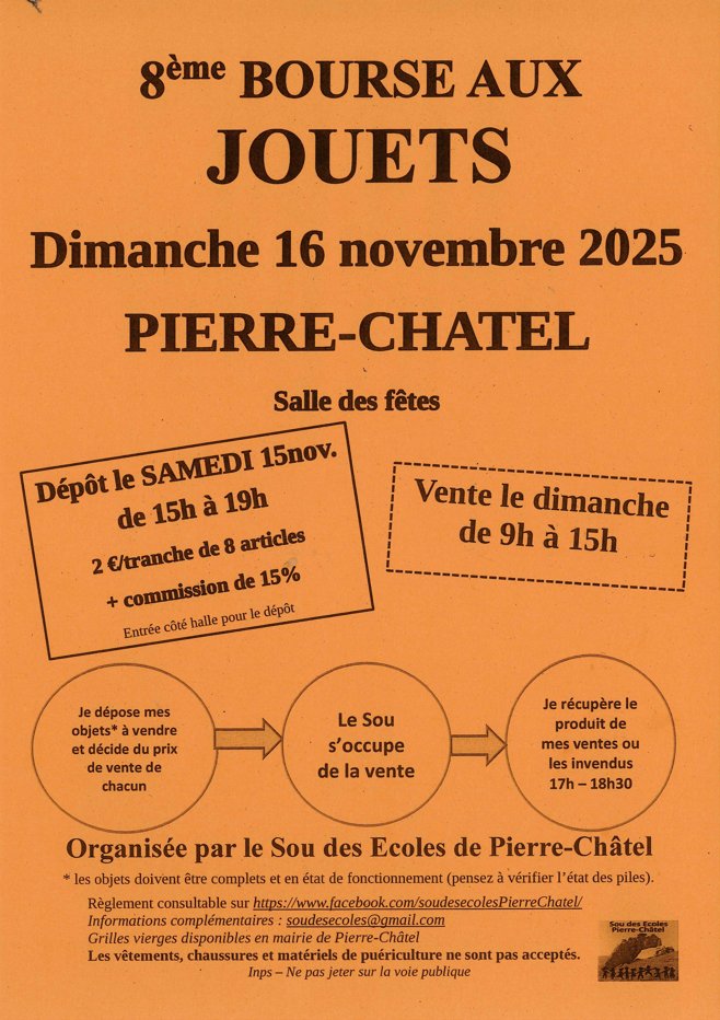 8ème bourse aux jouets organisée par le Sou des Ecoles de Pierre-Châtel à la salle des fêtes de Pierre-Châtel.